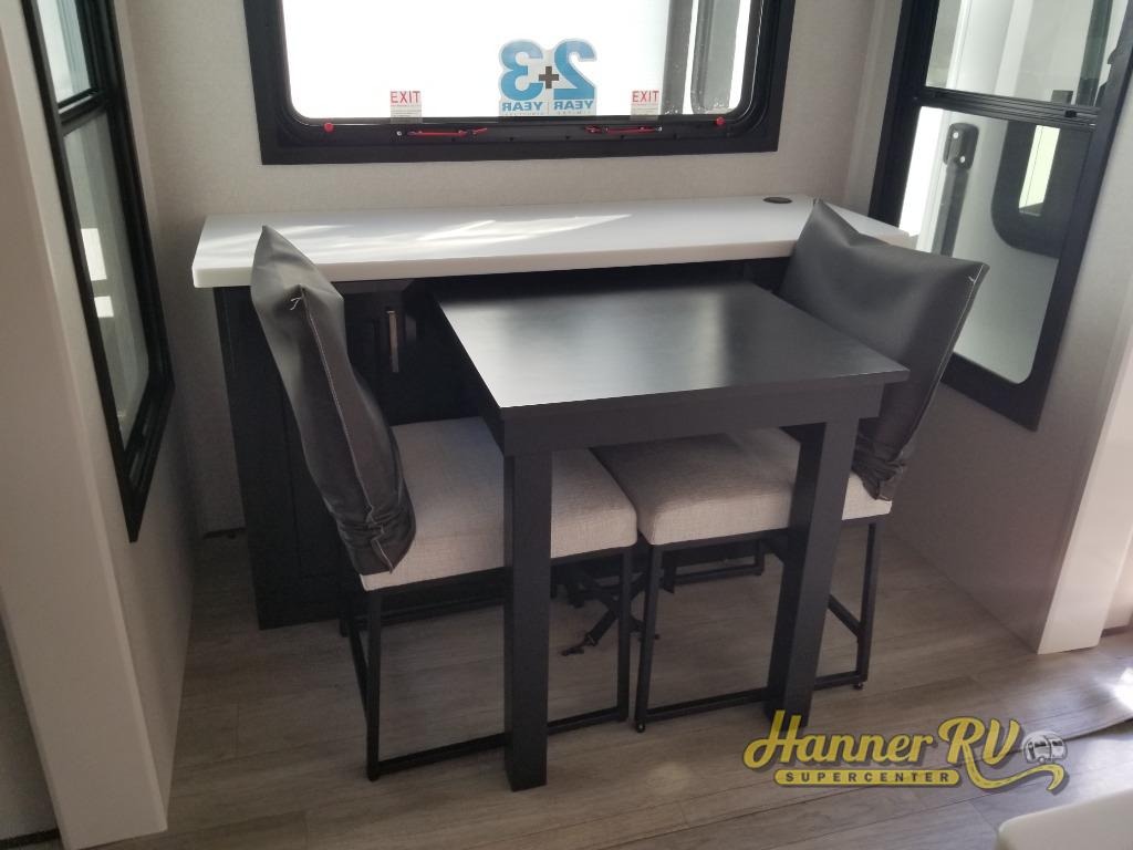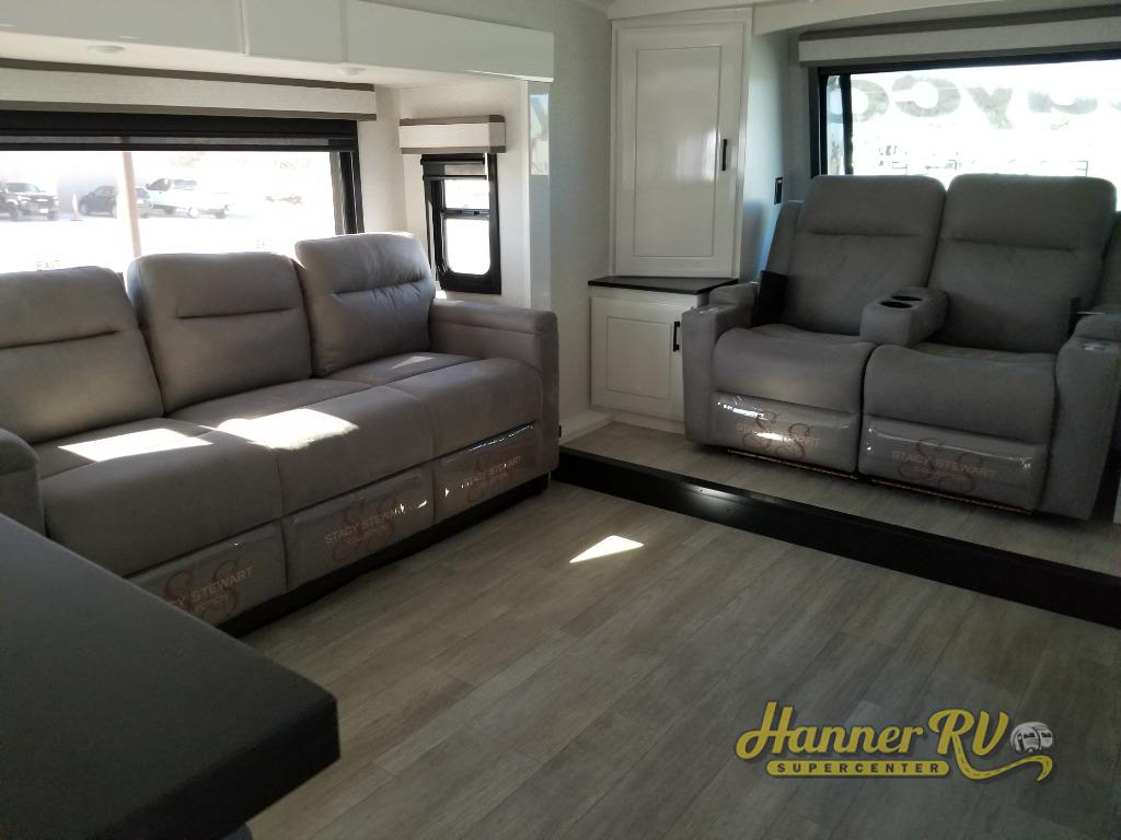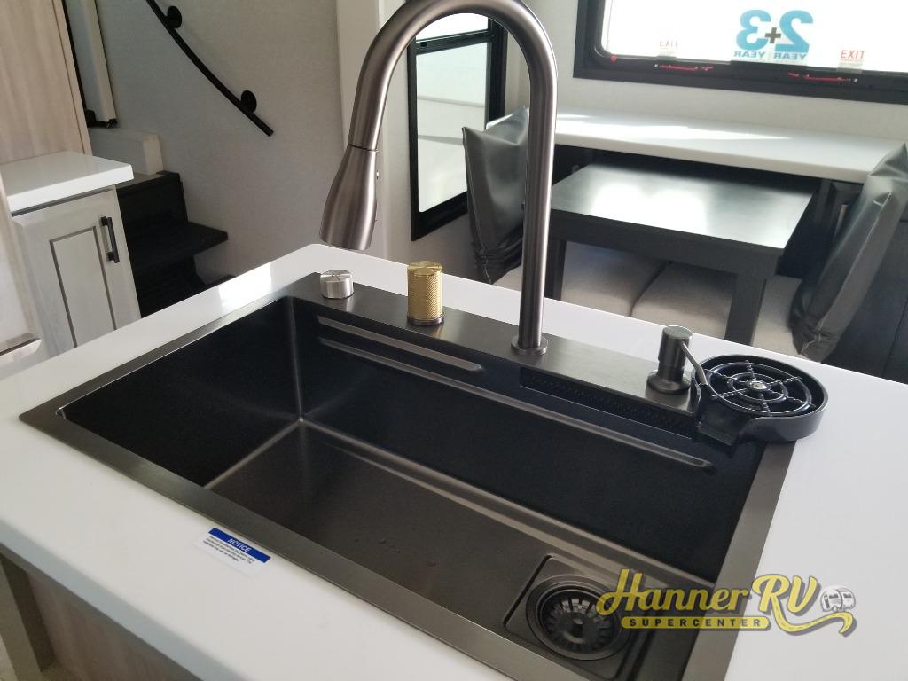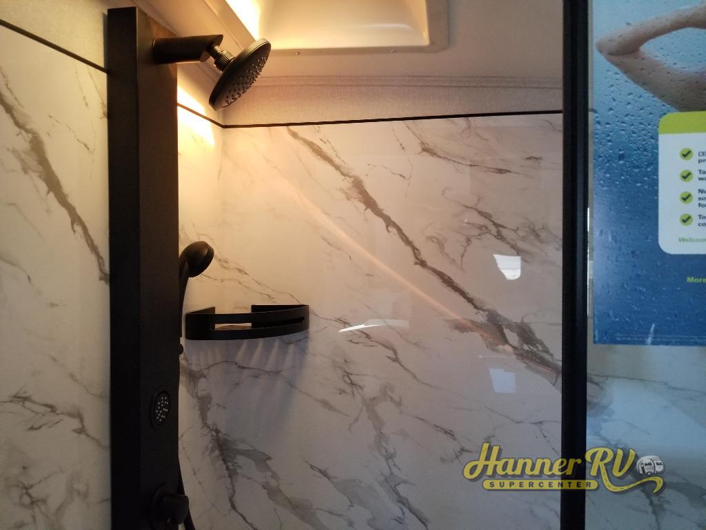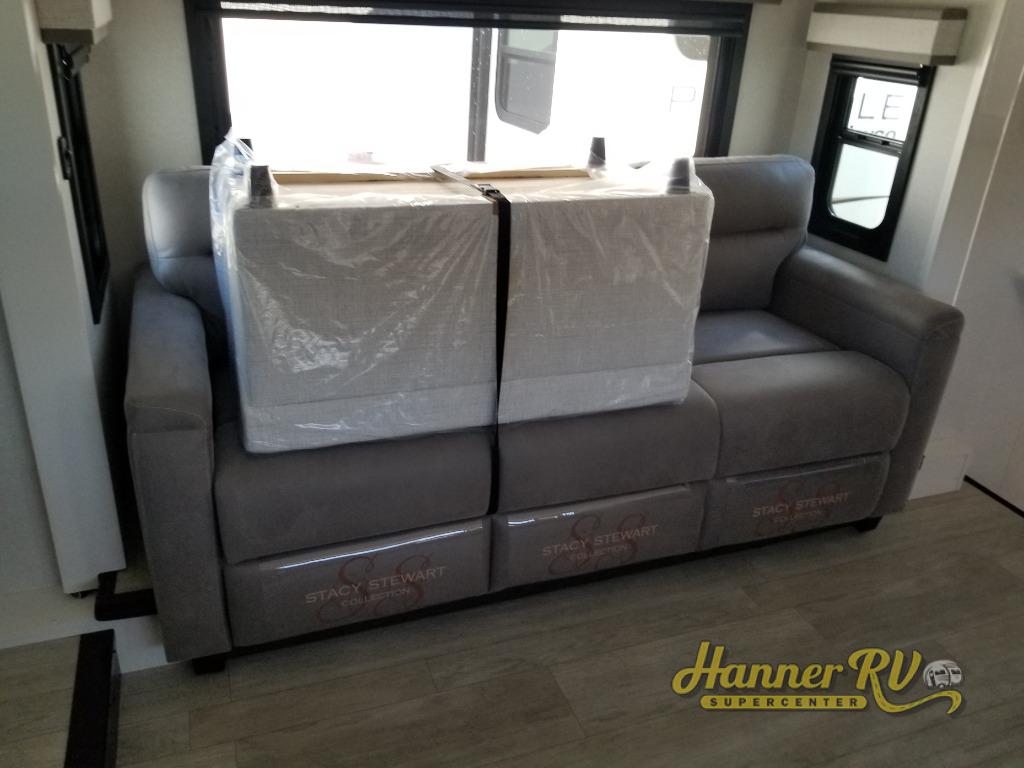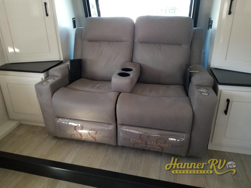 At the front of this fifth wheel, a spacious living area welcomes you with a theater seat and dual opposing slides that hold two tri-fold sofas, perfect for gathering the whole crew after a day of adventure and easily converted into extra sleeping space when needed. A 65" TV enhances cozy movie nights. Moving into the center, the kitchen opens up with its own slide-out, offering a 21-cu. ft. residential refrigerator, 30" convection microwave, 24" range, and plenty of overhead cabinets, along with a functional island equipped with a sink, pull-out cutting board, and generous prep space. A pantry sits conveniently nearby for dry goods, while a half bath across the way adds everyday convenience. Opposite the island, a roll-top dinette in another slide provides even more room to move around and the perfect spot for meals or board games. Toward the rear, the spacious bedroom features a 72" x 80" king bed in a slide for added walking space, along with a bench, a 32" TV, and dual wardrobes for clothing and essentials. At the very back, a luxurious full bathroom awaits, complete with double sinks for smooth morning routines and a 36" x 48" shower with a built-in seat for comfort and accessibility.