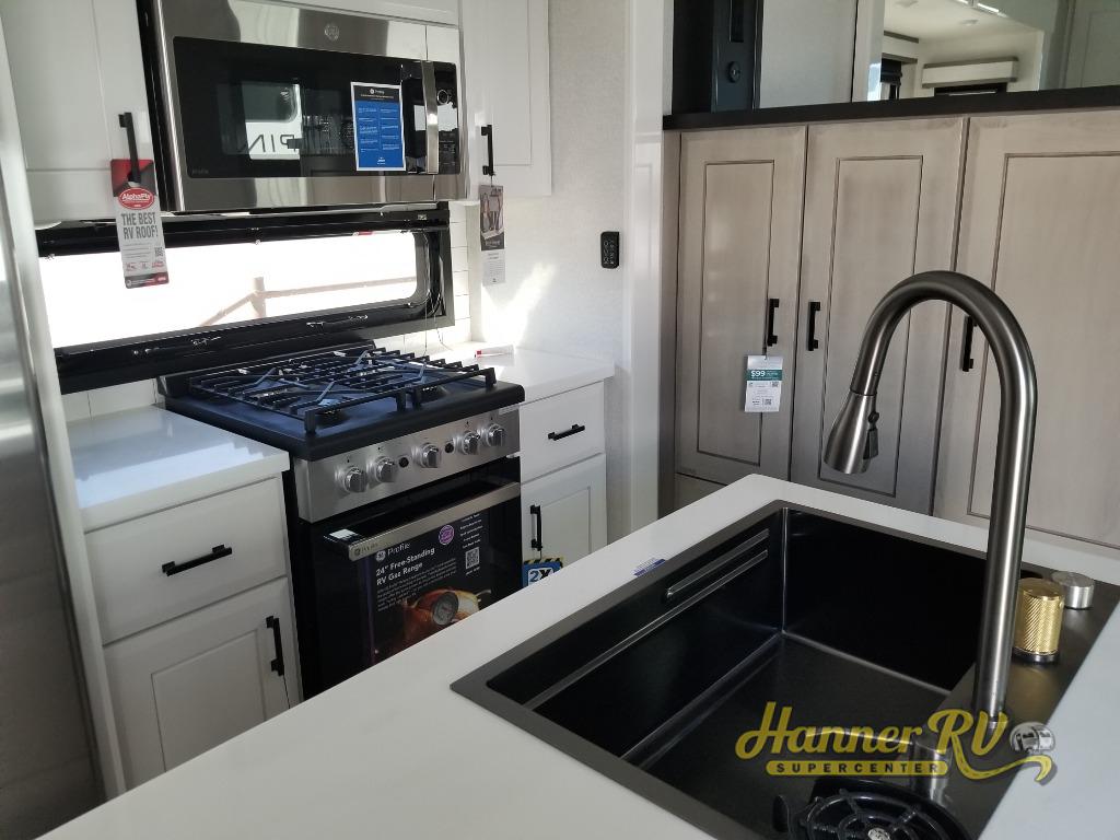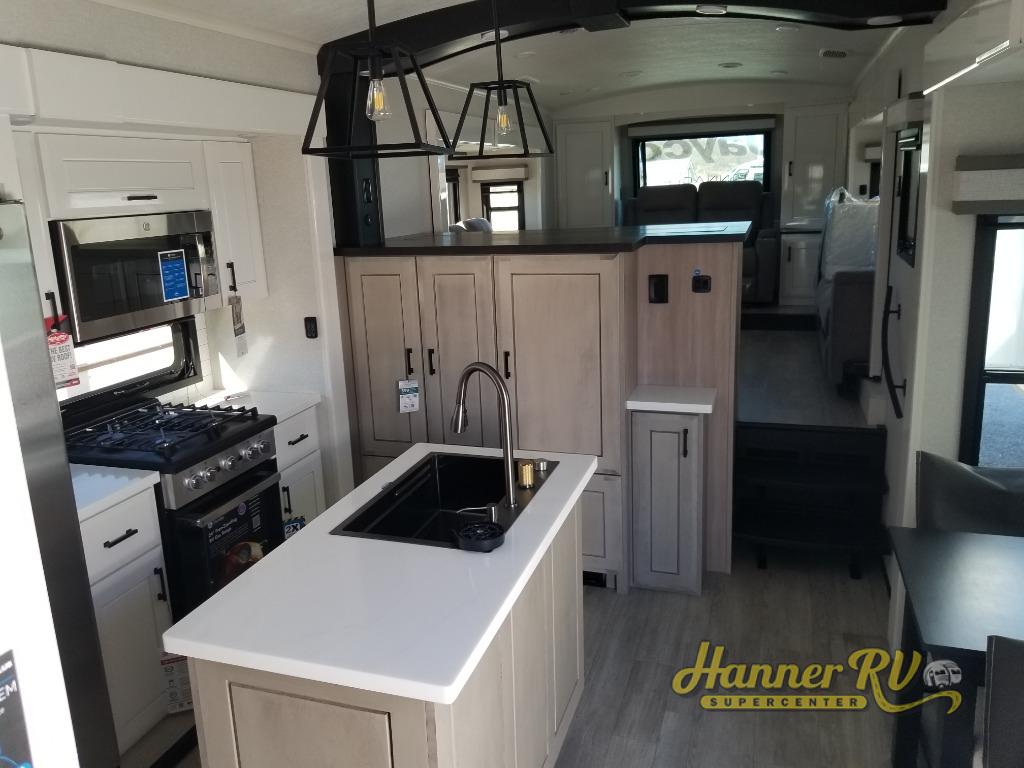 Each Pinnacle fifth wheel features Stronghold VBL lamination for the lightest, yet strongest construction in the RV industry. Add that to the Magnum Truss XL6 roof system and Climate Shield zero-degree tested weather protection and you'll be enjoying your fifth wheel even in harsh weather. Some of the exterior conveniences you will appreciate are the Keyed-Alike lock system, the fully enclosed, universal docking center, and the 6-point hydraulic auto-leveling system for quick and easy set up. The 5 Star Handling Package will make towing a fifth wheel a walk in the park, and the two Whisper Quiet A/C units will keep you comfortable during the hot summer months. Inside, you'll enjoy the residential "Do it all" sink, the solid hardwood cabinet doors, stiles, and fascia, the vinyl flooring throughout, plus many more comforts. There is even a central vacuum system, a wireless remote-control system, 12V charging station, plus many more conveniences to make each trip enjoyable.