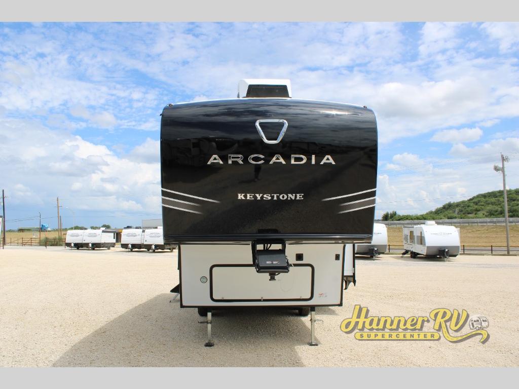With any Arcadia Select fifth wheel by Keystone you will enjoy easy towability and at-home comforts at an affordable price! The laminated sidewalls with five sided aluminum superstructure will provide a strong foundation so you can enjoy your RV for years to come, plus a one-piece, heated and enclosed polypropylene underbelly means you can camp year around! And an upgraded Roto-Flex hitch pin with will make it easy to tow. Head inside to find tall slides for added space, seamless, pressed countertops, convenient underbed storage, and a large shower with a retractable door and skylight. These fifth wheels also include a Blade Pure A/C system, Girard on-demand tankless water heater, two 30 lb. LP tanks, and more utilities to make your camping experience run smoothly.