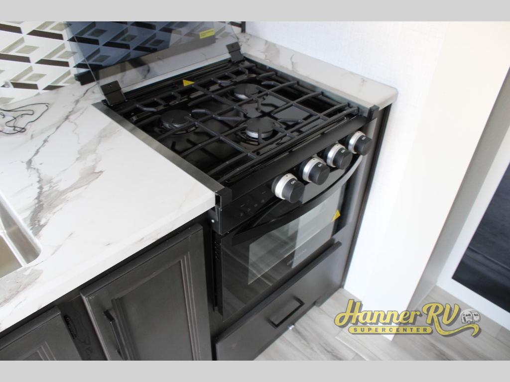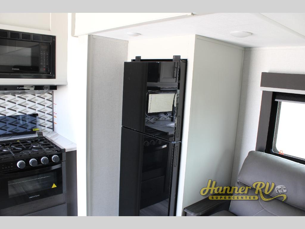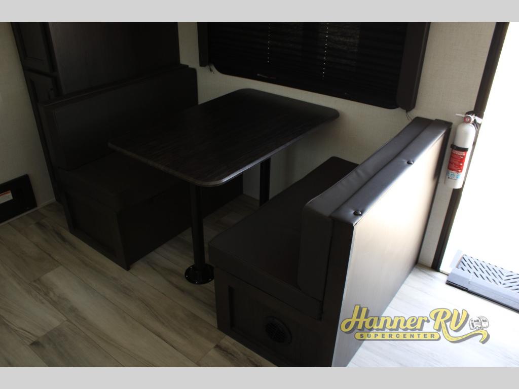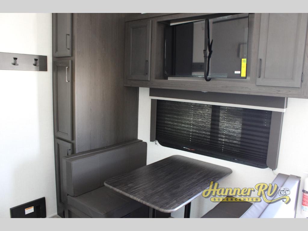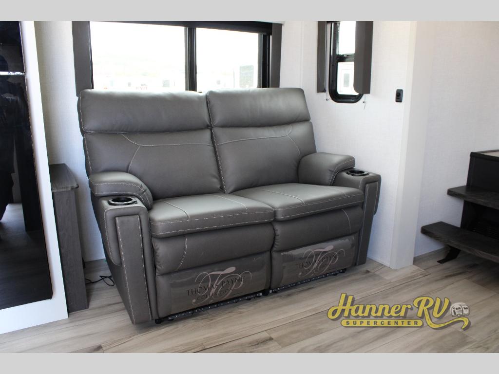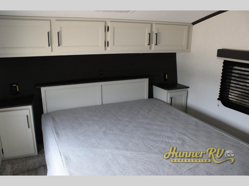 This rear kitchen fifth wheel includes ample counter space to prep meals and feed your crew. There is a tri-fold sleeper sofa slide for added space and a TV right across the sofa for easy viewing, or you can choose the optional theater seating if you don't need the extra sleeping space. Once lunch is ready, you can dine at the booth dinette or head outdoors to sit under the 17' electric awning. The full bath lets you clean up each day, and you'll feel right at home having your own private bedroom up front with a queen bed!