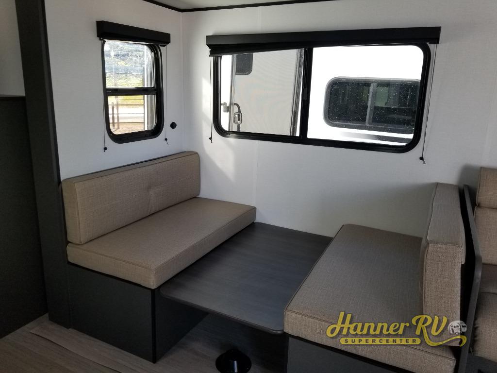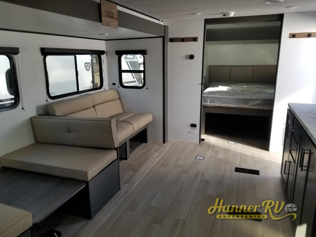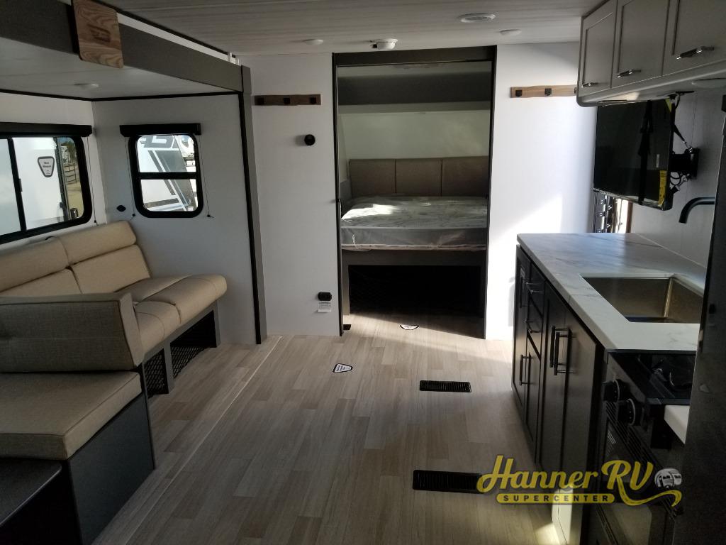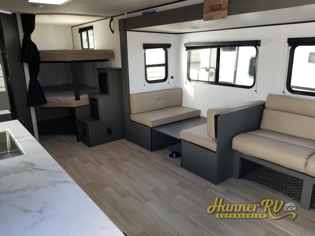 This travel trailer is designed for discerning families who crave adventure! The double-sized bunks provides a snug and inviting sleeping spot for kids, while the immaculately appointed full bathroom is thoughtfully designed for a refreshing stay. The kitchen is equipped with a generous pantry for storing gourmet ingredients, a high-performance refrigerator for keeping drinks and meals perfectly chilled, a rapid-cooking microwave, and a precision-crafted two-burner cooktop for preparing exquisite meals. Expansive overhead cabinets provide ample storage for fine china and cookware. The stylish booth dinette provides an intimate and convivial spot for meals and snacks, while the plush jackknife sofa offers a comfortable seating area that can be converted into a luxurious sleeping space. And after a long day in the woods, rest in the private front bedroom featuring a sumptuous queen-sized bed with a convenient nightstand and spacious dual wardrobes on each side.