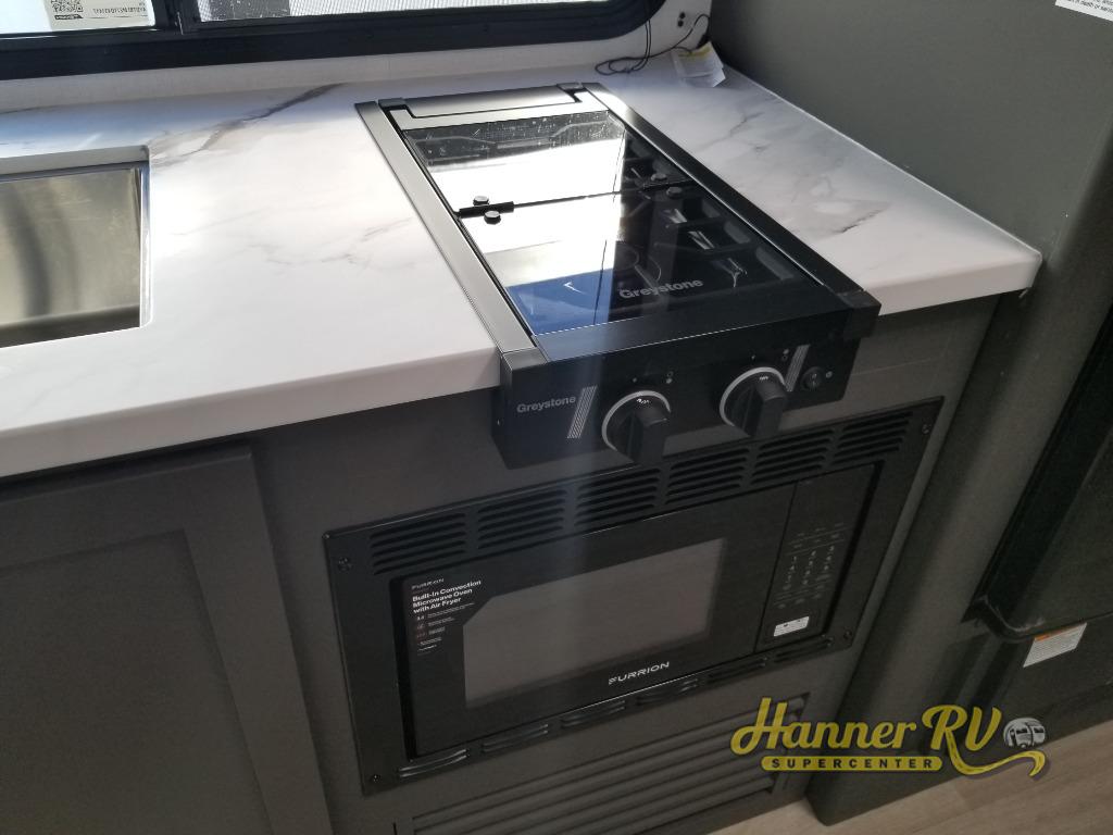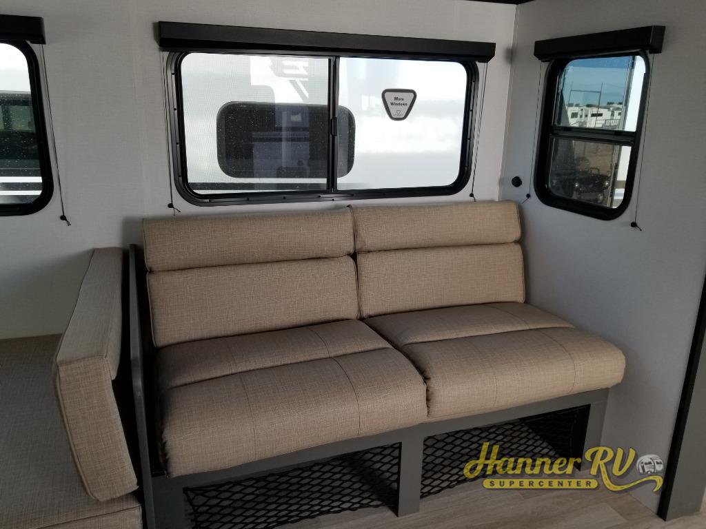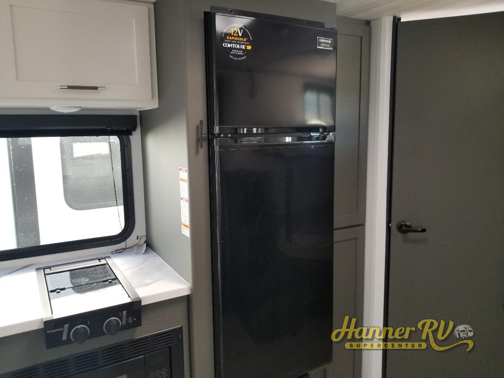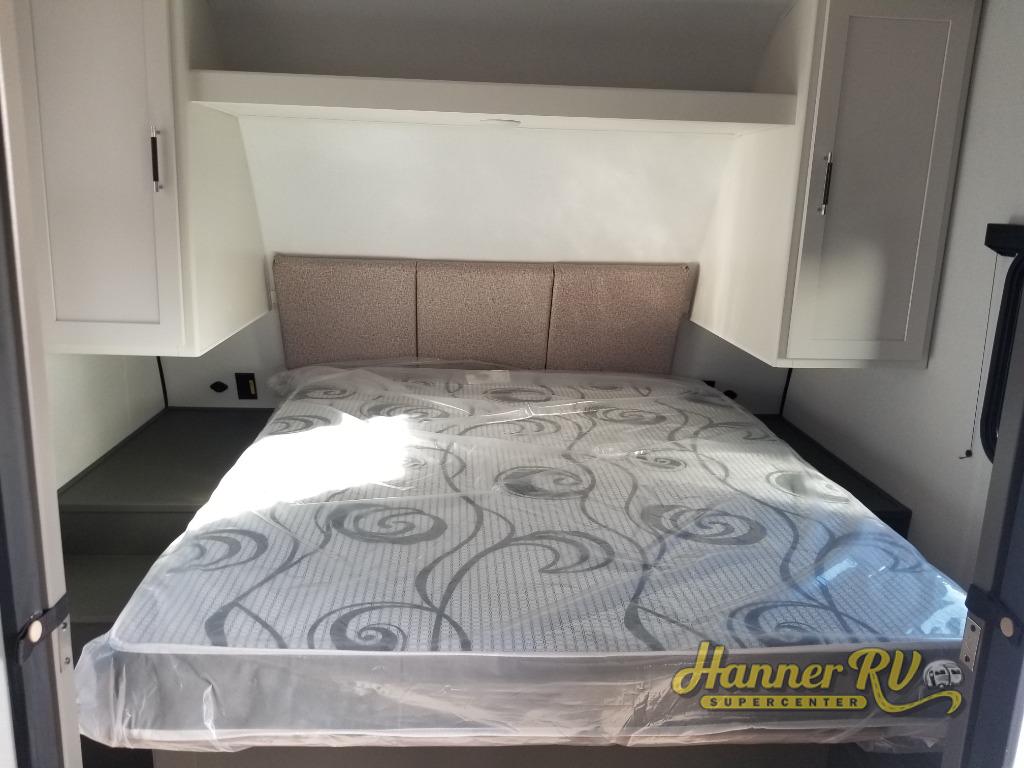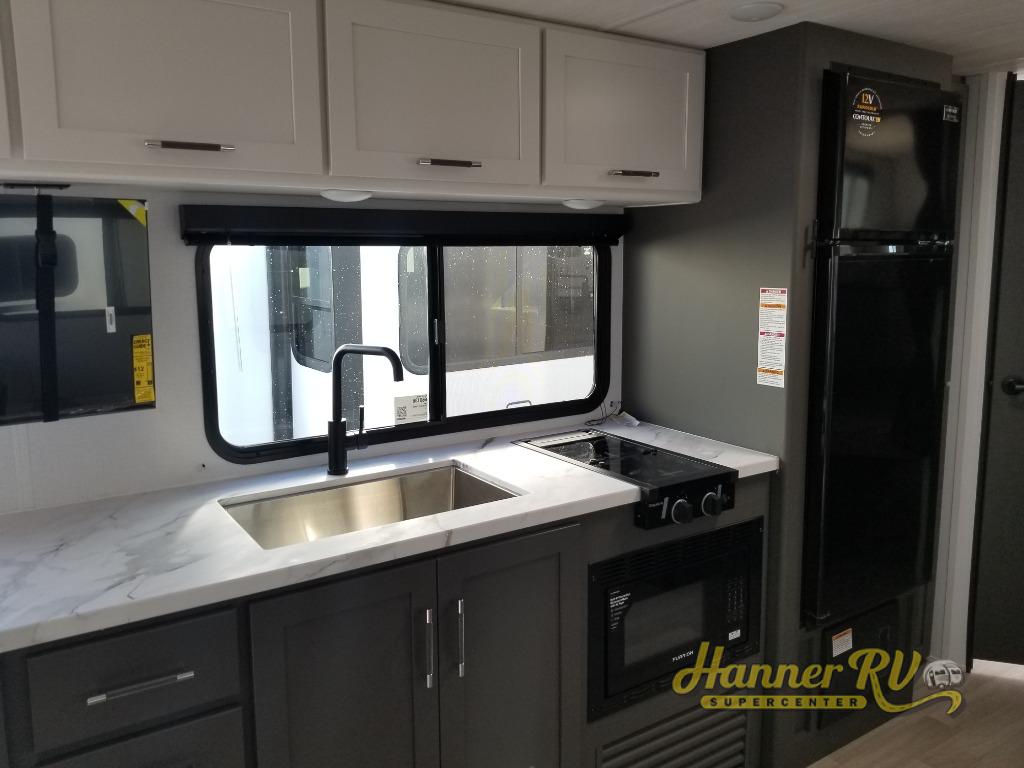 This travel trailer is designed for discerning families who crave adventure! The double-sized bunks provides a snug and inviting sleeping spot for kids, while the immaculately appointed full bathroom is thoughtfully designed for a refreshing stay. The kitchen is equipped with a generous pantry for storing gourmet ingredients, a high-performance refrigerator for keeping drinks and meals perfectly chilled, a rapid-cooking microwave, and a precision-crafted two-burner cooktop for preparing exquisite meals. Expansive overhead cabinets provide ample storage for fine china and cookware. The stylish booth dinette provides an intimate and convivial spot for meals and snacks, while the plush jackknife sofa offers a comfortable seating area that can be converted into a luxurious sleeping space. And after a long day in the woods, rest in the private front bedroom featuring a sumptuous queen-sized bed with a convenient nightstand and spacious dual wardrobes on each side.