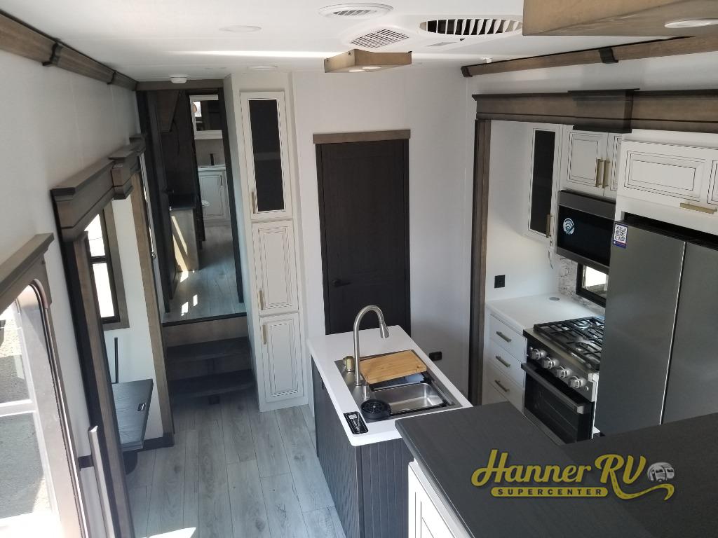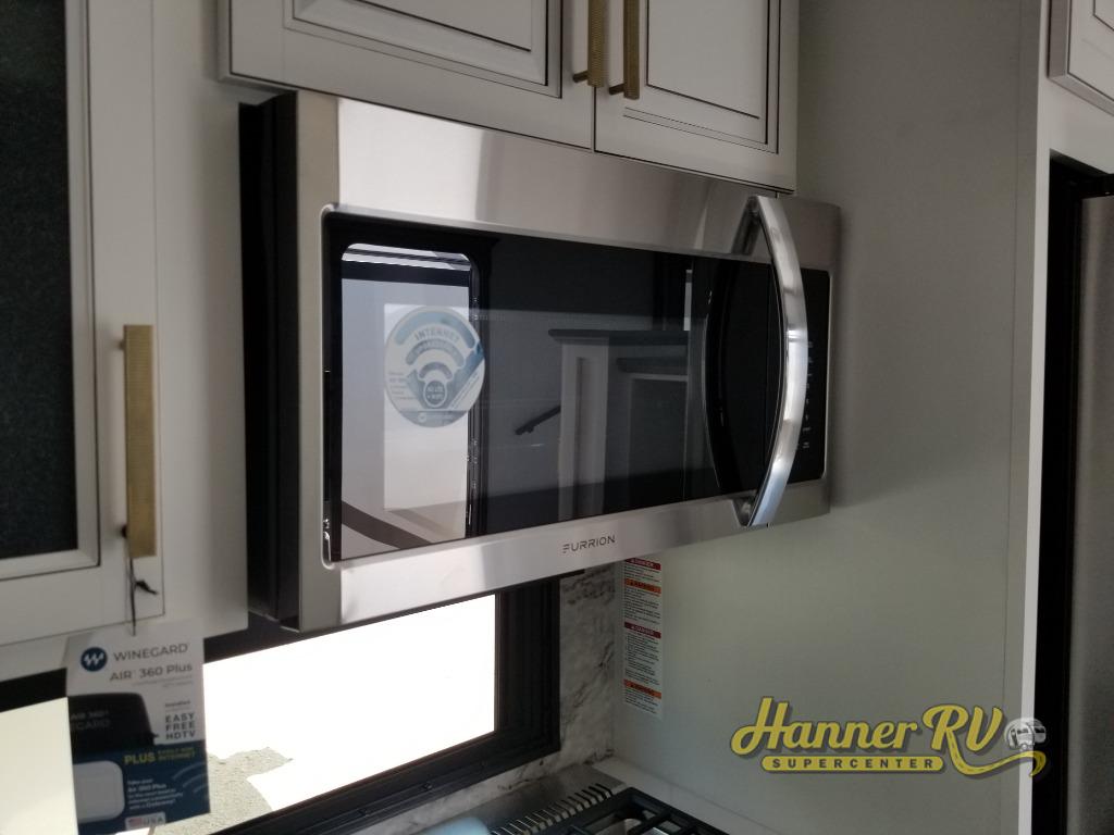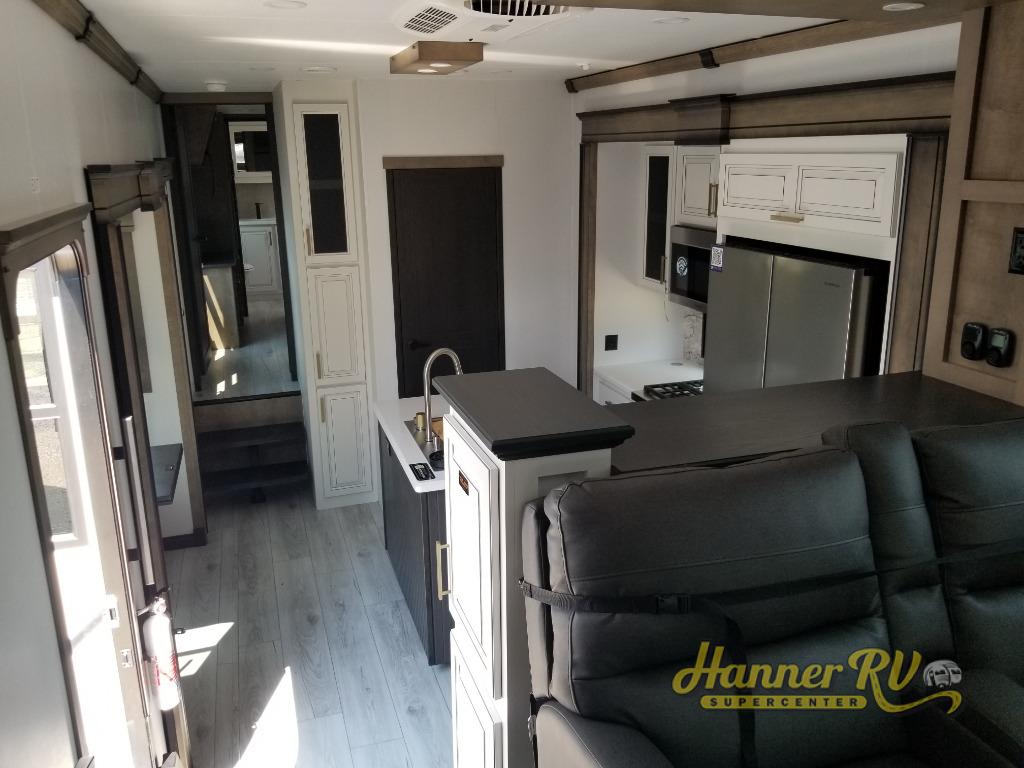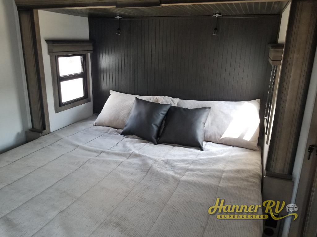 Life will be easier at the campground in this fifth wheel with a bath and a half! The full rear bathroom has a 48" x 30" fiberglass shower with a seat and skylight above, a linen closet to keep your towels close, a dual sink vanity for two to get ready at once, and a barn door to close off the master suite. The bedroom also has a king bed slide with storage underneath across from a dresser with a 32" Smart TV and wardrobe, as well as a large closet with stackable washer and dryer prep. The chef can prepare their best meals with the kitchen island, convection microwave and 24" range, plus there is a pantry/buffet and a pivot dinette to enjoy your meals at. The front living area will have you feeling right at home with the front entertainment center that has a telescoping 50" Smart TV, a 5,000 BTU decorative fireplace heater, and storage on either side. There is also opposing hide-a-bed sofa slides for extra sleeping spaces and power theater seating for even more comfort!