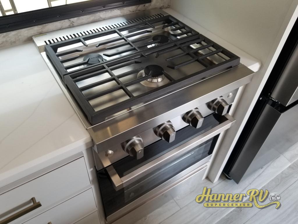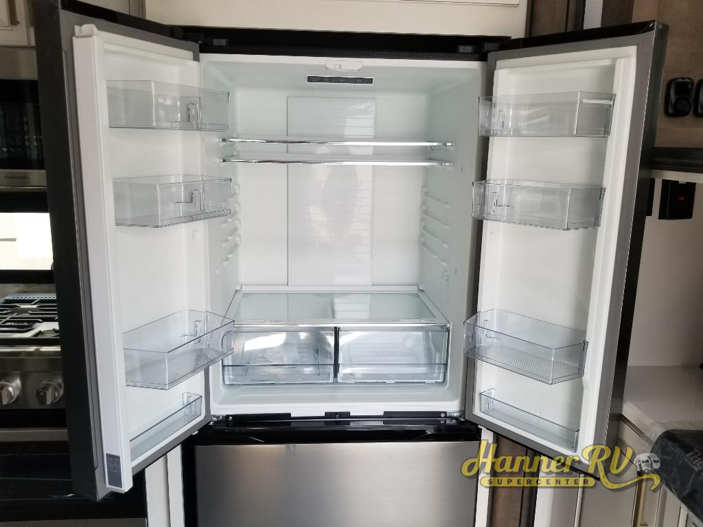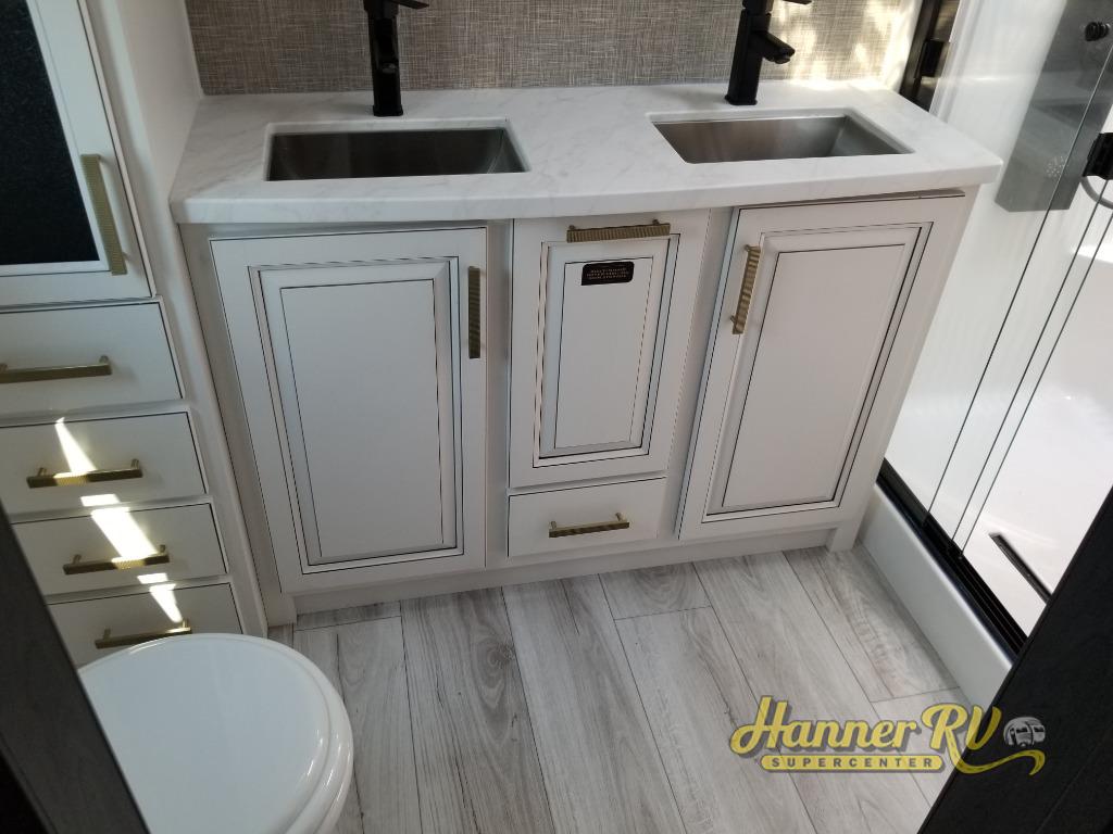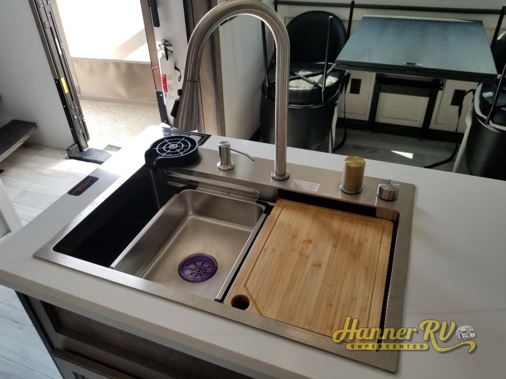 Life will be easier at the campground in this fifth wheel with a bath and a half! The full rear bathroom has a 48" x 30" fiberglass shower with a seat and skylight above, a linen closet to keep your towels close, a dual sink vanity for two to get ready at once, and a barn door to close off the master suite. The bedroom also has a king bed slide with storage underneath across from a dresser with a 32" Smart TV and wardrobe, as well as a large closet with stackable washer and dryer prep. The chef can prepare their best meals with the kitchen island, convection microwave and 24" range, plus there is a pantry/buffet and a pivot dinette to enjoy your meals at. The front living area will have you feeling right at home with the front entertainment center that has a telescoping 50" Smart TV, a 5,000 BTU decorative fireplace heater, and storage on either side. There is also opposing hide-a-bed sofa slides for extra sleeping spaces and power theater seating for even more comfort!