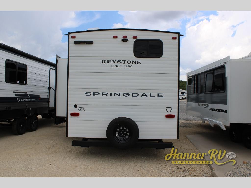 The Springdale Classic travel trailers by Keystone will provide you and your family many great outdoor experiences and it will also be kind to your pocketbook. Each one is constructed with an aluminum exterior, a walkable roof, and an I-beam frame with stamped steel cross-members and outriggers for added strength. There are also heavy duty stabilizer jacks and power tongue jacks outside, along with an XL entry assist handle for added convenience. Each travel trailer includes LED lighting, bedside outlets, and blackout night shades inside that will provide you with more privacy at night.