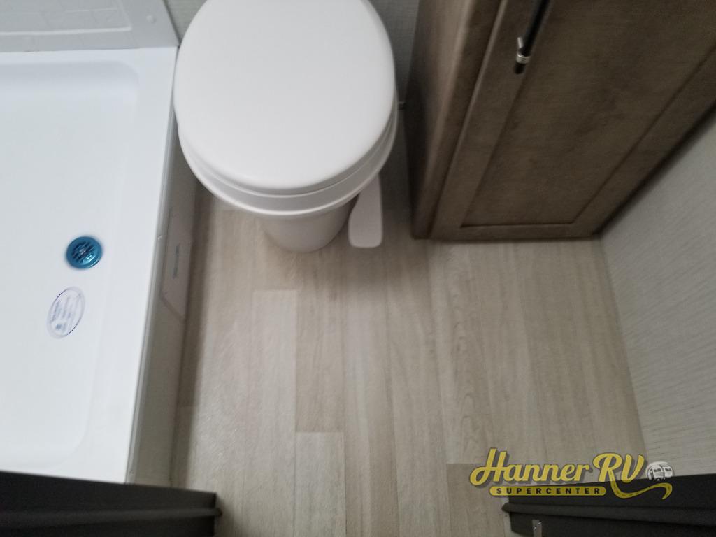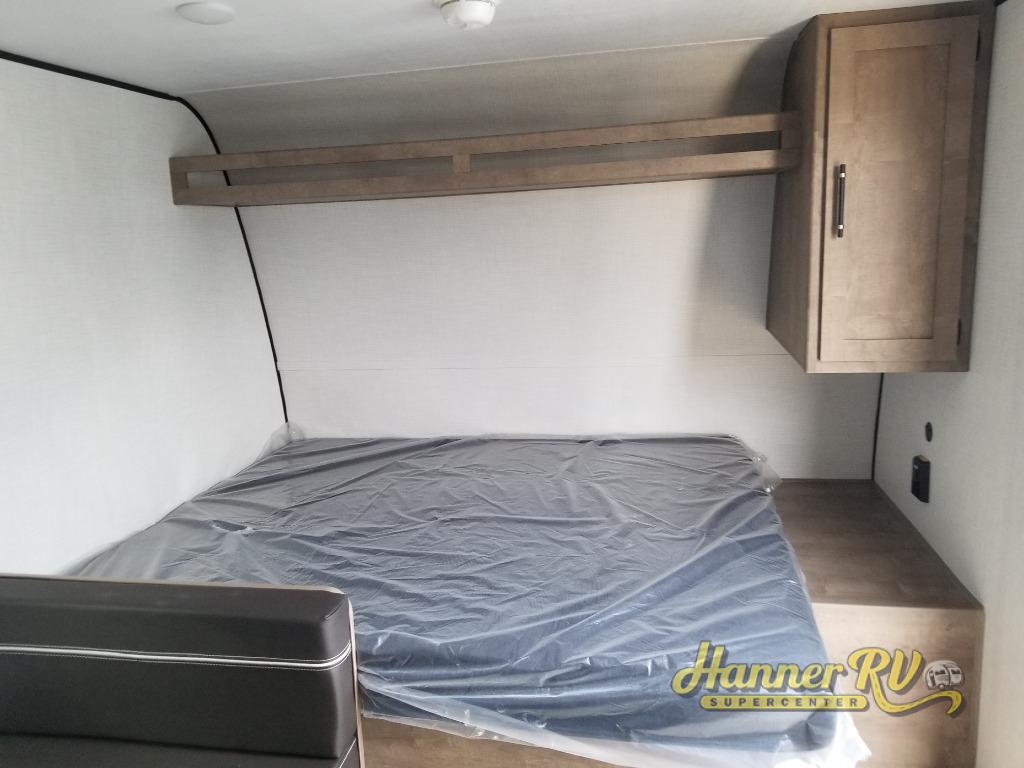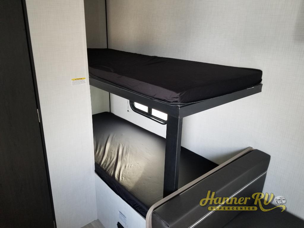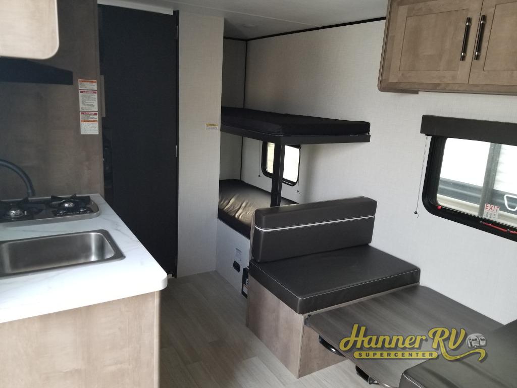 This travel trailer with rear corner bunk beds is sure to be a hit at the campground! While your guests or little ones take the bunks, you can enjoy the front Olympic RV queen bed to yourselves. There is even storage under the bed, an overhead shelf, and a wardrobe for your things. The chef of your group can whip up meals on the two-burner cooktop or in the microwave oven, and there is a 3.3 cu. ft. 12V refrigerator to keep food fresh. A booth dinette provides a place to dine together, or you can take your plate outdoors to sit under the 8' power awning with LED lights!