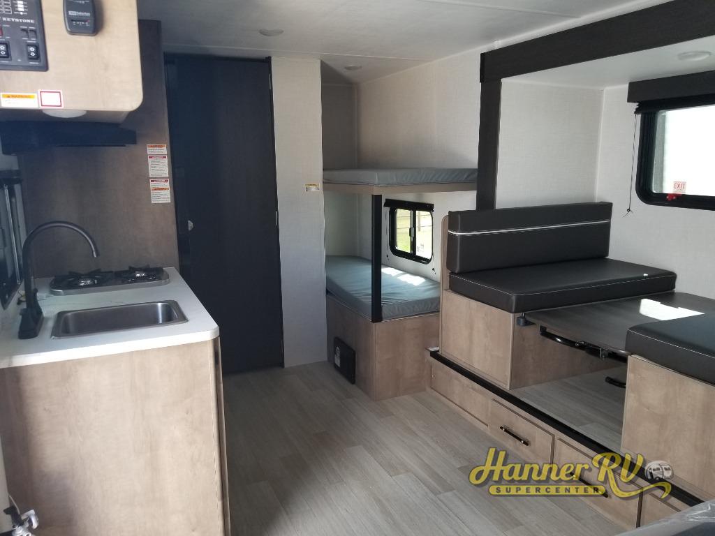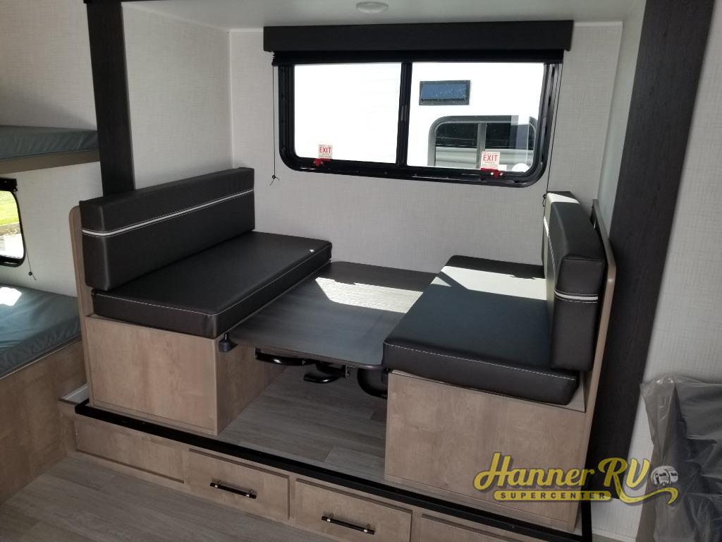 When you say "camping" your kids will immediately think about sleeping on the bunk beds and playing outdoors! There is something about planning the trip that gets everyone excited, and once at your campsite, the excitement grows. You will have your own bed up front as well as a closet and nightstand for your things. The booth dinette doubles as sleeping space and includes drawers for storage, plus the slide provides more floor space. The cook can make warm meals in the galley kitchen, and the full bathroom will keep everyone refreshed and ready for the next day.