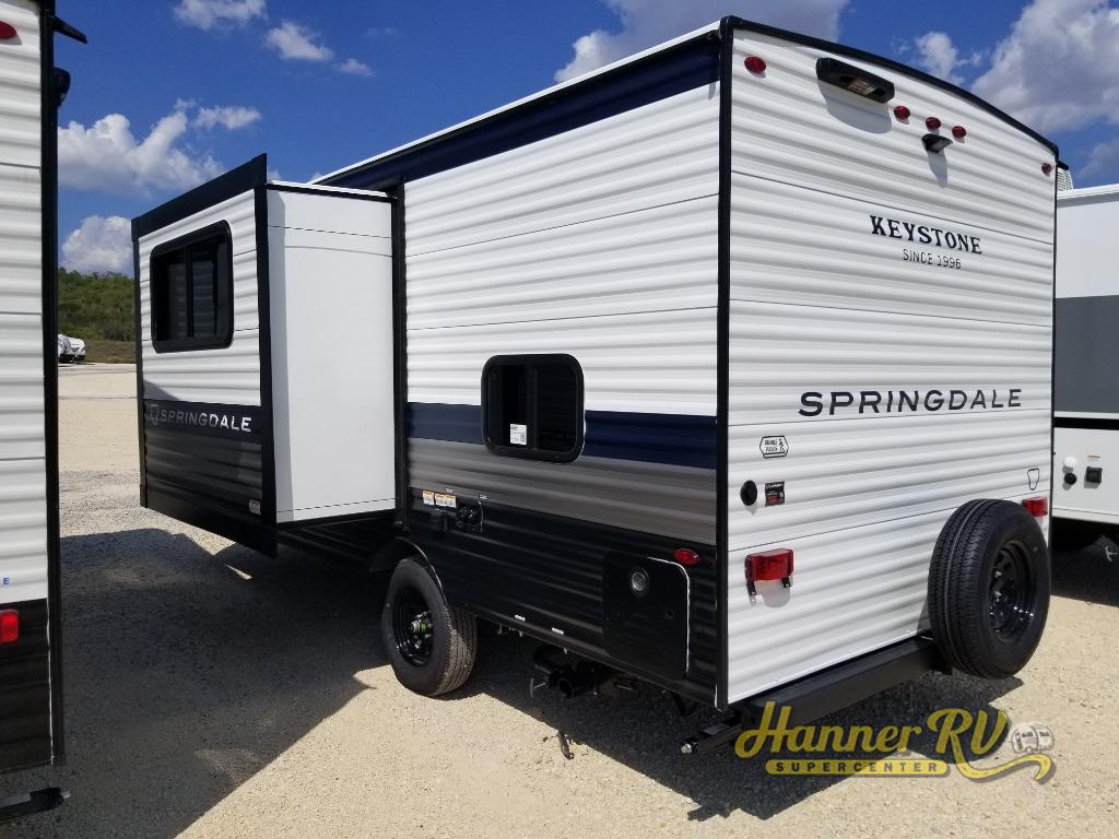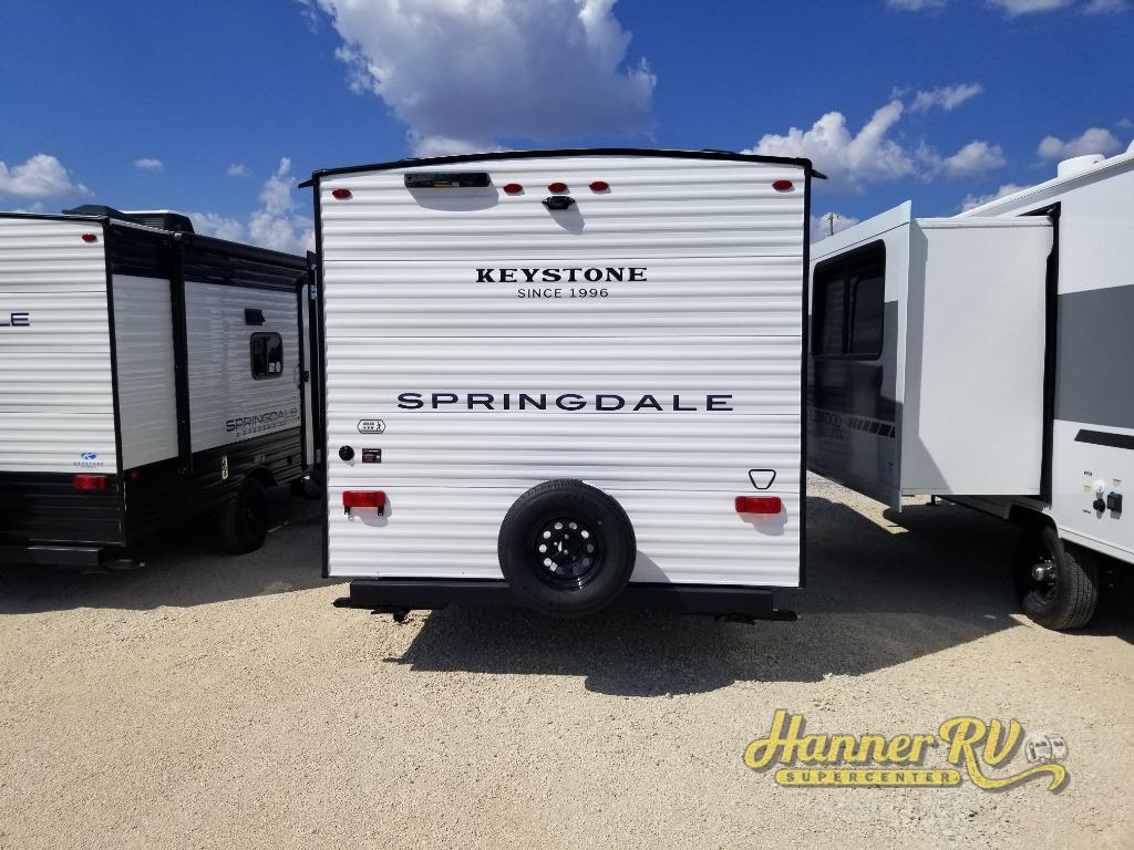 With any Springdale Mini travel trailer by Keystone, you will enjoy lightweight towing thanks to their single-axle! The AlphaPly TPO roof membrane is ultra durable, and the power awning will provide protection from the sun as you relax in your camp chairs outside. Each model includes blackout night shades, LED lighting, plus many more interior comforts. There is also a roof A/C and 20K BTU furnace to keep you comfortable, plus a tankless water heater for endless hot showers!