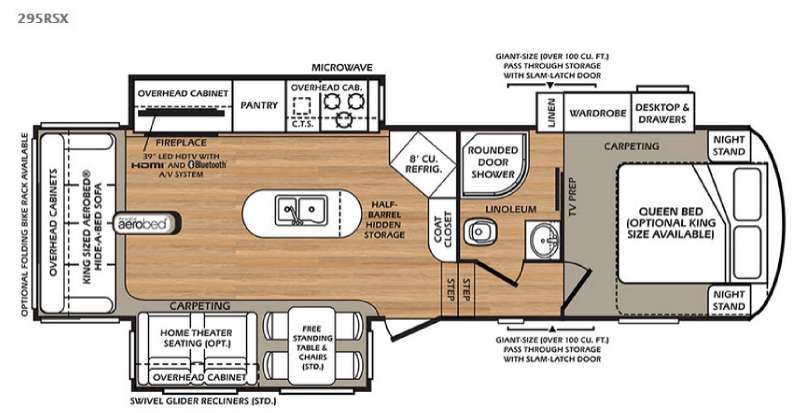 Inside the bedroom you will find a queen bed, or you can choose an optional king bed, and nightstands on either side of the bed. The slide has a desktop & drawers, wardrobe, and linen cabinet.