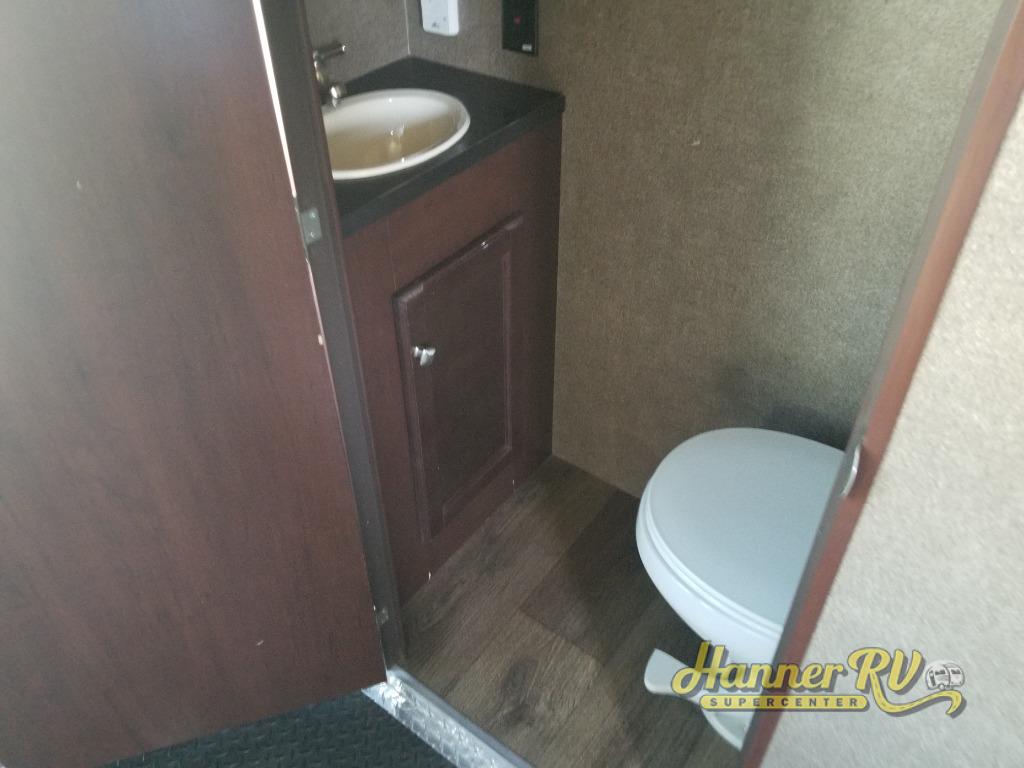 Get started with 12' of garage space including a rear ramp door for ease of loading and unloading. There is also a side man door into the cargo area if you need to check on things while on the move or after the rear ramp door is closed. There is also an additional loft space in the front of the cargo area and a convenience half bath too. A ladder to the loft can be found just inside the main living area door.