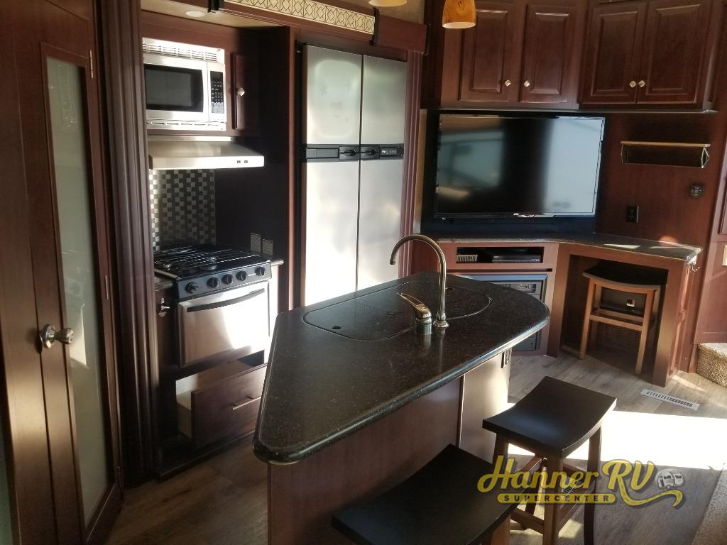Inside the 425 combined living and kitchen area you will find a spacious retreat. A large sofa with two dining tables will provide plenty of seating for meal time or game time along the curb side wall. There is a center island bar that features a double kitchen sink. Behind the island is a slide out three burner range, plus a refrigerator and pantry for all of your cooking and food prep needs.