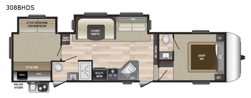 This Hideout fifth wheel 308BHDS by Keystone RV has everything you need, and the space you want for your entire family! There is an outside kitchen which makes it easy to watch the kids play while fixing your meals. Throughout this model you will find sleeping space in the private front bedroom, the tri-fold sleeper sofa, the u-shaped dinette, plus there is a bunkhouse for your kids to enjoy. A bath and a half makes it easy for everyone to get ready for the day. This model also has two entry doors so now you can visit with your family or friends just a bit longer around the campfire in the evening without waking any sleeping kids when it is time to head for bed.