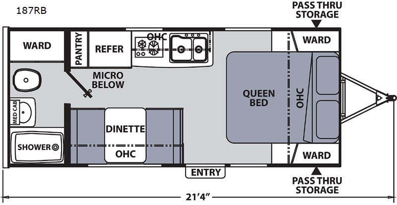 This Apex Nano model makes camping more enjoyable for two or a small family. Model 187RB offers a front queen bed for the owners, plus a booth dinette for added sleeping space for one. This cozy model also provides a full bathroom including a wardrobe. There is plenty of storage throughout on the interior along with a front exterior pass-through compartment that is accessible from either side. After you have enjoyed a fun day on the trails, you can rinse off at the outdoor shower and crank up the tunes too with the outdoor speakers. Stop imagining how much fun you will have, and start living it!