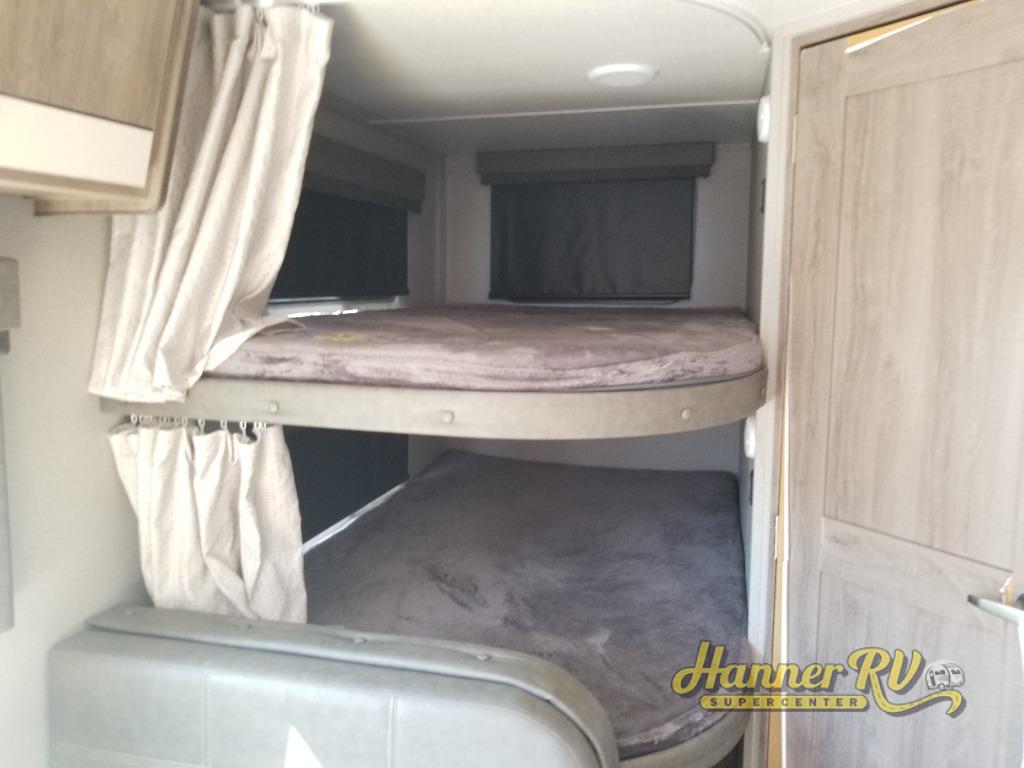 Your family will enjoy each and ever trip in this trailer with sleeping space for six between the double-size bunks in the rear with privacy curtains and the walk-around queen bed in the private bedroom, plus the booth dinette that doubles as extra sleeping space for one! After hiking the trailers and hanging out around the campfire, the cook can make meals inside with full amenities within the slide out including a double door refrigerator or outdoors using the outside kitchen. The 20' electric awning provides a covered area for all to enjoy, just add your camping chairs. Everyone can take turns getting cleaned up in the full bathroom before bedtime and some might like to watch the HD TV before falling asleep.