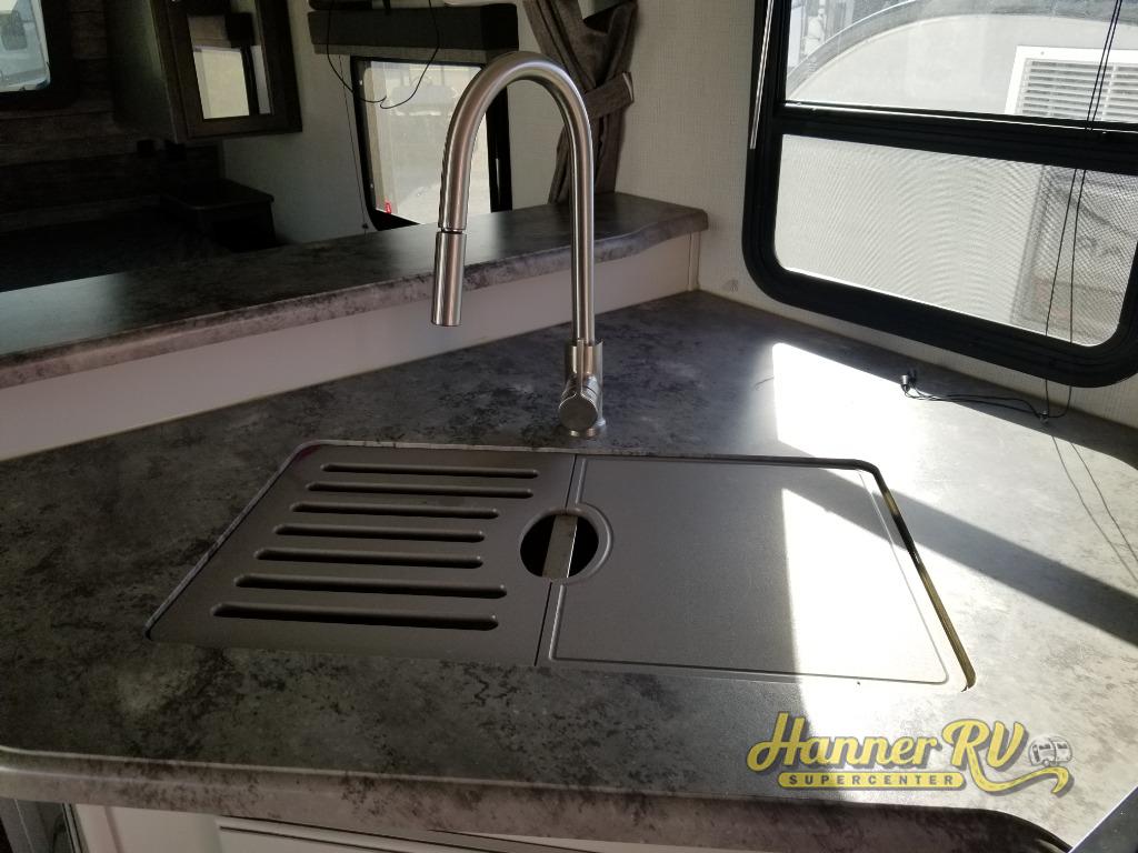 Imagine waking up from your own king bed to enjoy a hike, a bike ride, or a relaxing time outside under the 16' power awning while you wait for your spouse to wake up. With this Cougar Half-Ton travel trailer, you can make breakfast inside with full amenities and eat at the U-shaped dinette while looking out at the views. You will be able to get cleaned up in the full bathroom without having to wait your turn for the public facilities. Plus, there is a privacy curtain for the bedroom so that you have an additional place to get ready, and the bar top gives you extra room to sit down with a hot meal.