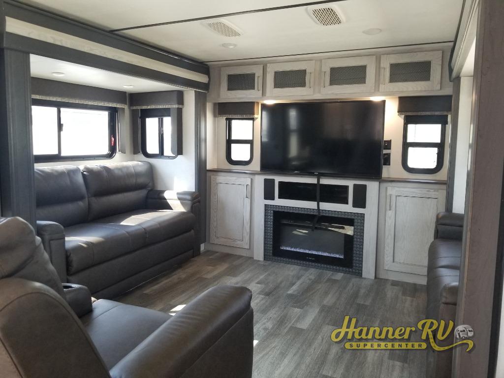 You and your family will enjoy the separate elevated den while watching the LED HDTV above the fireplace on either the dual hide-a-bed sofa slide outs, or the power theater seats. The separate kitchen area features a coffee station for the coffee lover in the family, a large pantry for your canned goods and snacks, a range with a glass top, and a residential refrigerator, plus a residential microwave. Outside you will find an outdoor living space under the awning once you place your camp chairs and mat down. The exterior storage tray slide out allows you to bring those larger items such as fishing poles, an outdoor table, and extra totes.