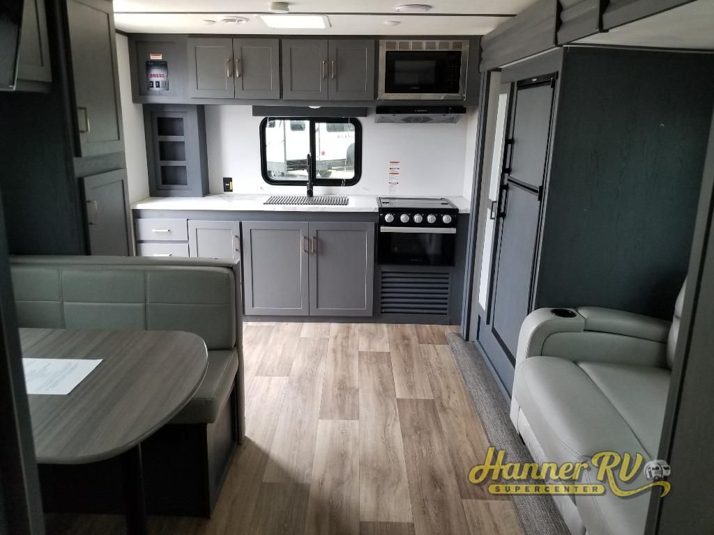 This rear kitchen travel trailer is perfect for your family of five to six. There are dual entry doors so you can enter in through the rear kitchen, or the front master bedroom. The spacious walk-through bath includes two linen closets to store toiletries and towels, plus there is plenty of counter space to get ready each morning. Whether you're relaxing on the tri-fold sofa, playing a game at the Dream Dinette, or visiting under the 19' power awning with LED lights, you'll enjoy every minute spent in this travel trailer!