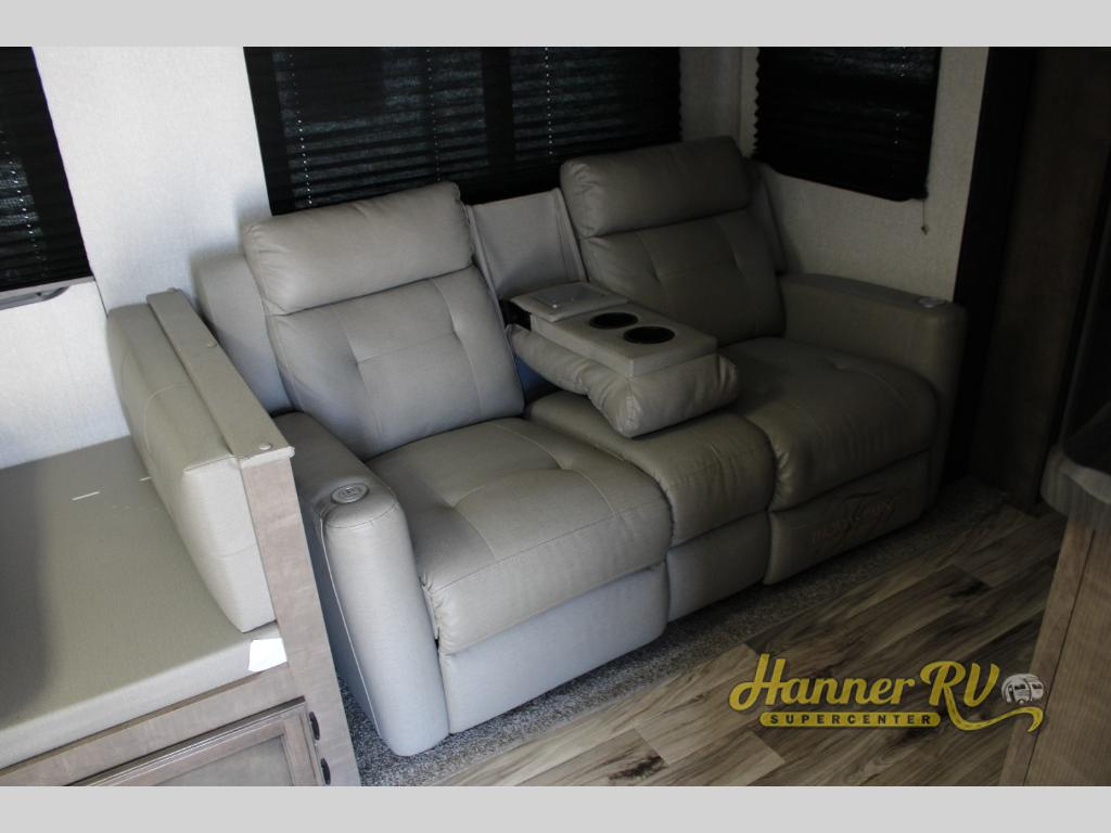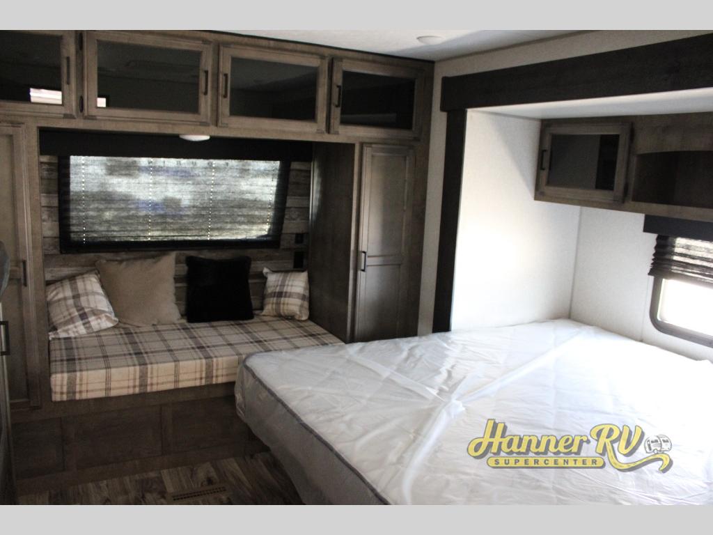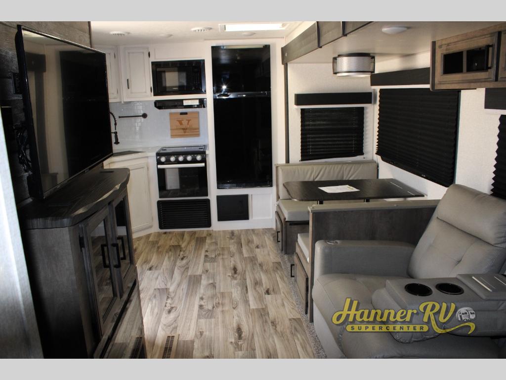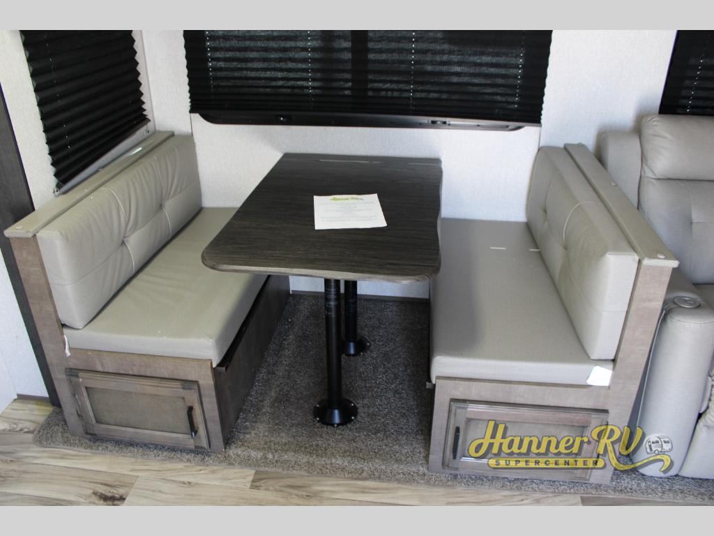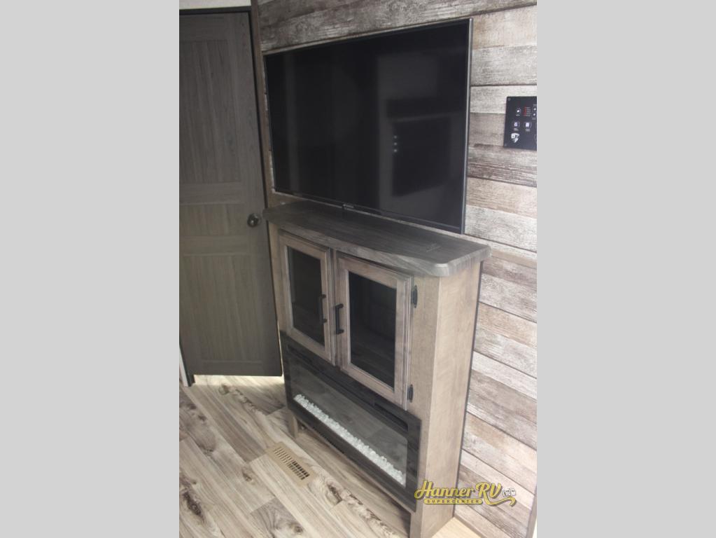 This travel trailer is perfect for two people who want to escape from everyday life! The front private bedroom has a 70" x 80" sleep tight king bed slide for more walking around space, a dresser with a 30" frameless fireplace and TV, and a window seat to read a book with a view. Freshen up each morning in the full bathroom with the 30" x 36" shower then head to the rear kitchen to fry up some eggs on the three burner cooktop. The 42" grand dinette offers a comfortable place to enjoy your meals, play card games, and even transform into an extra sleeping space. Grab a snack from the walk-in pantry and relax on the 70" tri-fold sofa across from the entertainment center with a 30" frameless fireplace!