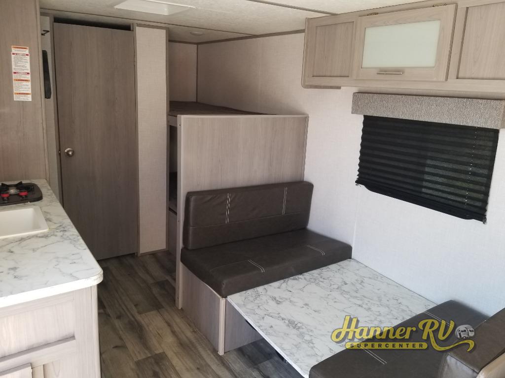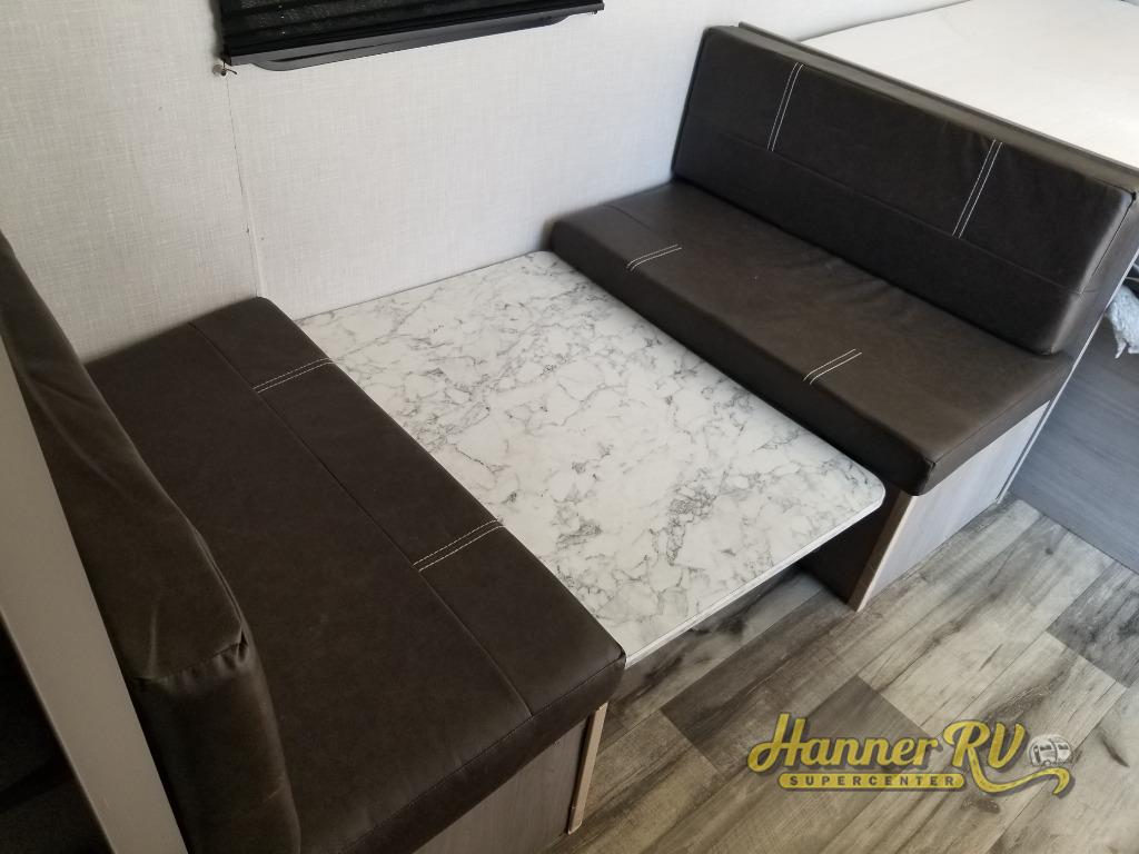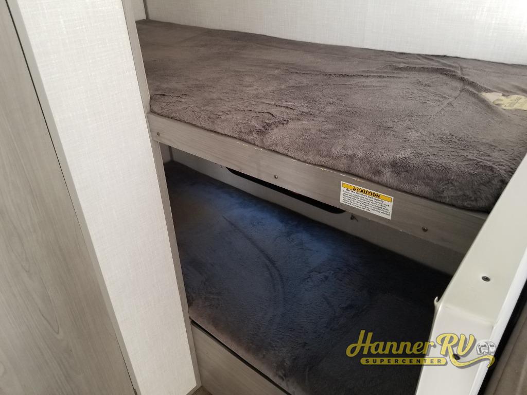After making dinner on the two burner cooktop or inside the microwave, you can dine at the booth dinette or outside under the 8' power awning if you brought along your camping chairs. Either way you will be comfortable and the dinette may even sleep one person if needed. After playing outdoors all day, everyone can return to get cleaned up in the private toilet and shower room then fall asleep on the queen bed up front or the bunk beds in the rear. And everyone can wake up the next morning to do it over again.