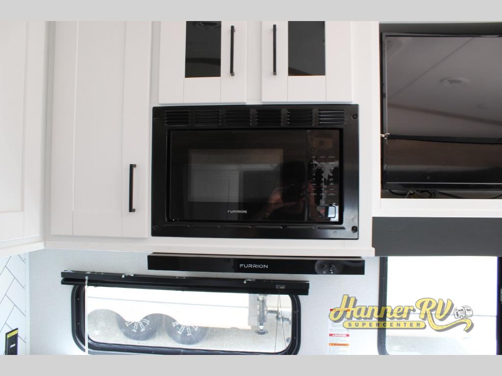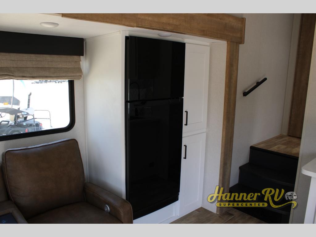 This fifth wheel is both spacious and easy to tow; so come take a look! When you arrive at the campground you can set up the 20' electric awning, then stretch your legs on a trail or two. The full bath will be waiting for you when you return, and you'll enjoy a large shower here with a glass door and a skylight for added light. Head to the full kitchen to prepare dinner on the three burner cooktop, or use the microwave oven here. There is also a high-rise chef's faucet and sprayer here and a 10 cu. ft. 12V "solar friendly" refrigerator with dent resistant doors. Your crew can dine around the U-shaped dinette with the fireplace close by, plus this model includes theater seating for all-around comfort! After a long day, the queen bed in the front bedroom will be calling your name, while your guests sleep on the rear dinette.