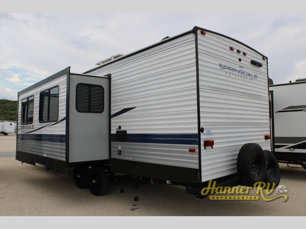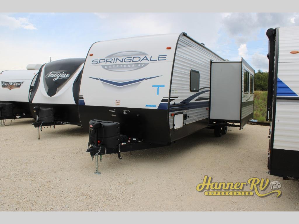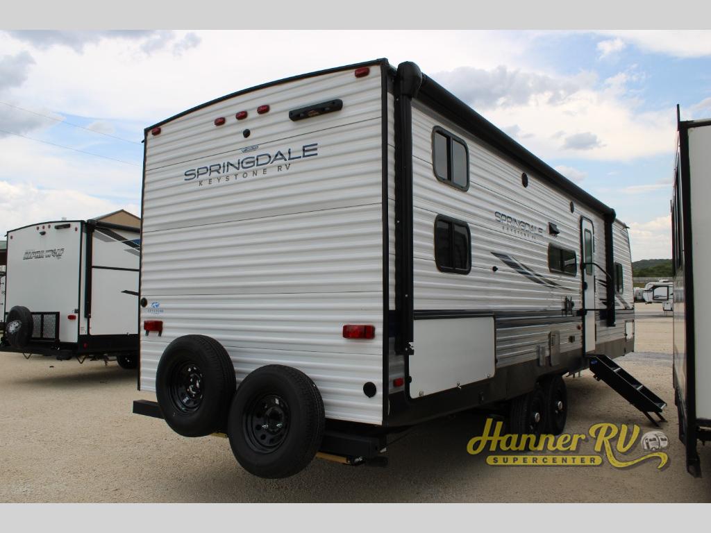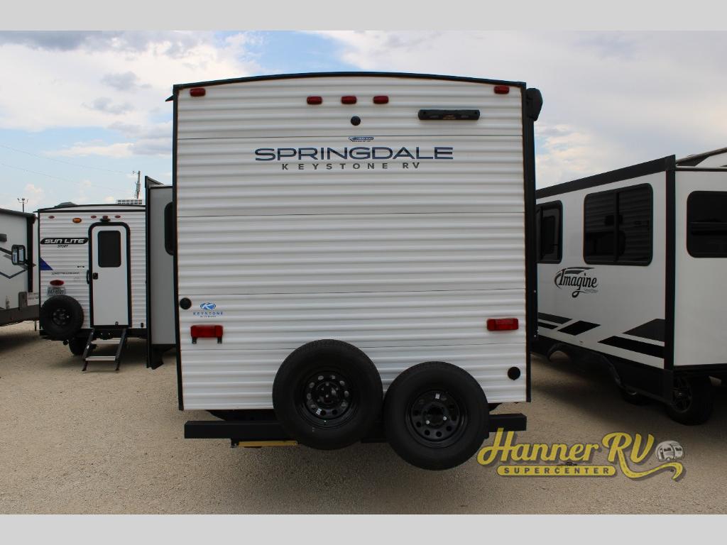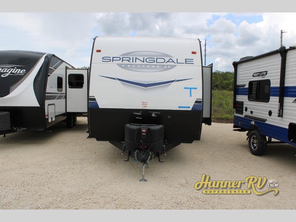 With any Keystone Springdale travel trailer, you will have a friction hinge entry door with sturdy MORryde StepAbove steps, a pass-through storage compartment for your outdoor gear, and reliable Dexter E-Z Lube axles to maneuver your Springdale down the road and into the campsites. Some of the Keystone Exclusives provide 12V color-coded wiring with easy-to-trace circuits which is better than conventional RV wiring allowing a faster diagnosis for quicker repairs, and the streamlined heat distribution that uses in-floor heat vents for more efficiency for uninterrupted air flow. Also included, the Blade high performance air flow system that delivers 30% more air flow. The interior gives you pressed kitchen countertops, pleated night shades, and designer upholstered window valances for easy care and style, and more depending on the Springdale you choose!