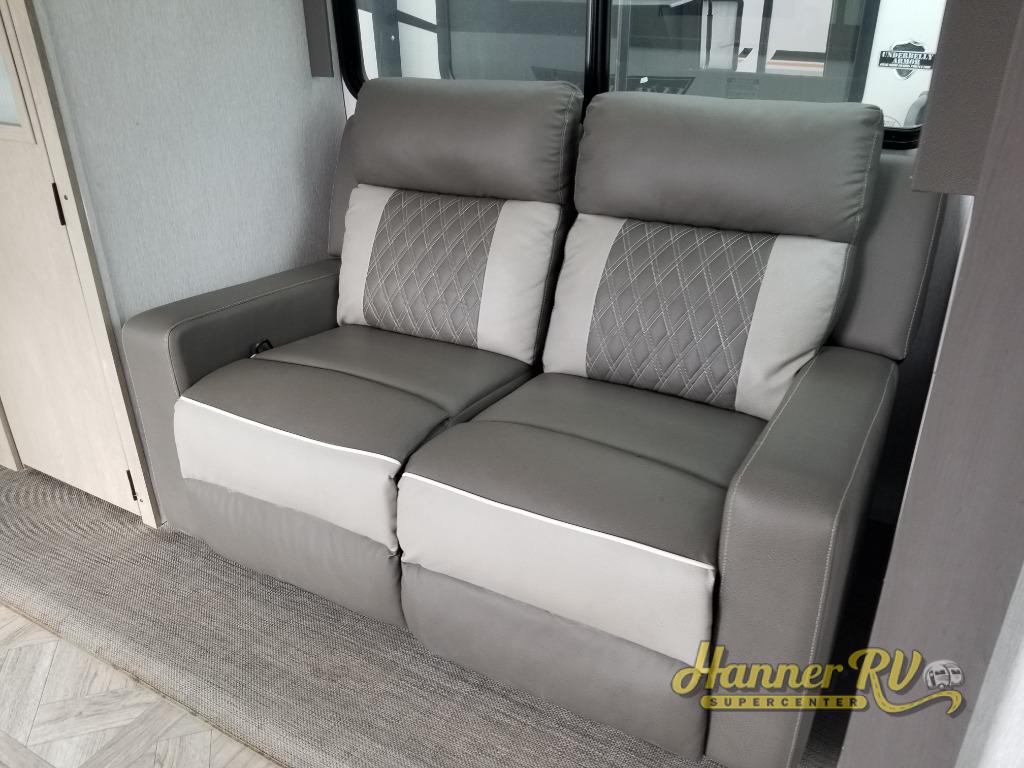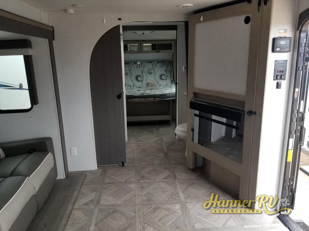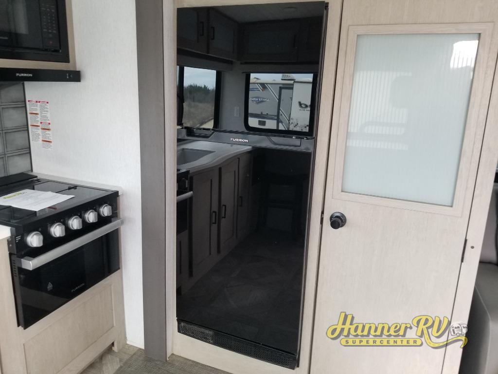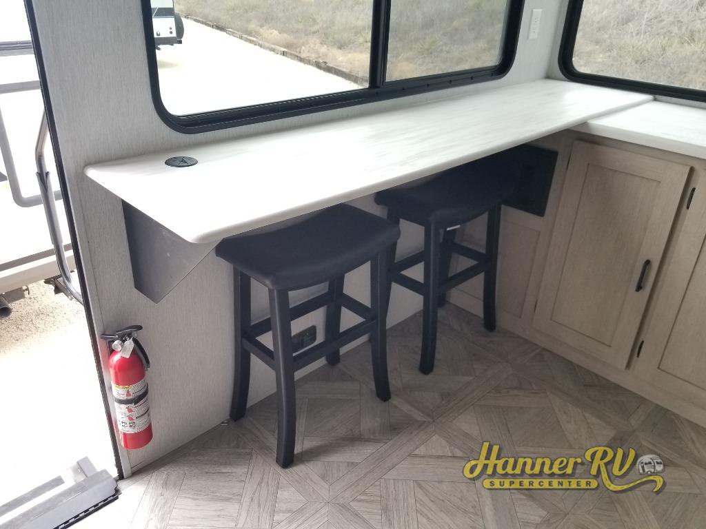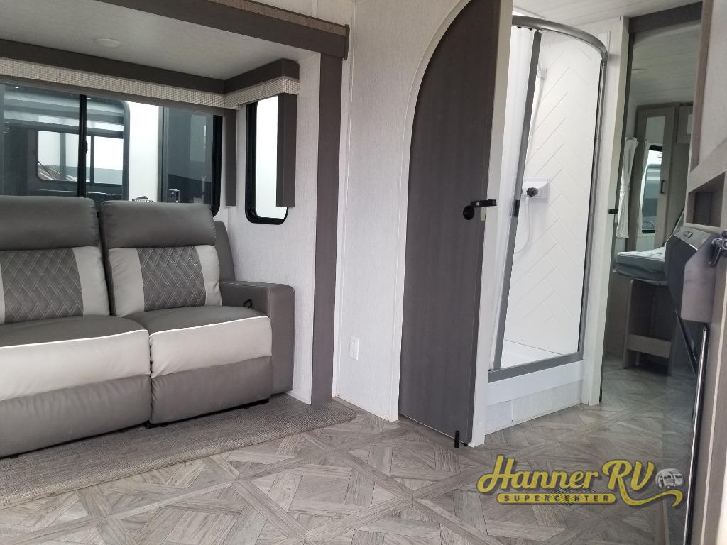 You're going to love cooking in the rear kitchen of this travel trailer! It has everything you need to prepare delicious home cooked meals including a large pantry and oversized fridge, plus there are two bar stools to sit on while you enjoy them. The theater seating is conveniently across from the swiveling entertainment center which has hidden shelves behind it for your games and movies. As you walk-through the bathroom, you will notice a walk-in shower to the left and a toilet and sink to the right. It leads directly into the front private bedroom which has a Versa-Tilt custom king bed to lay your head on at night and wardrobes/nightstands on either side for your items!
