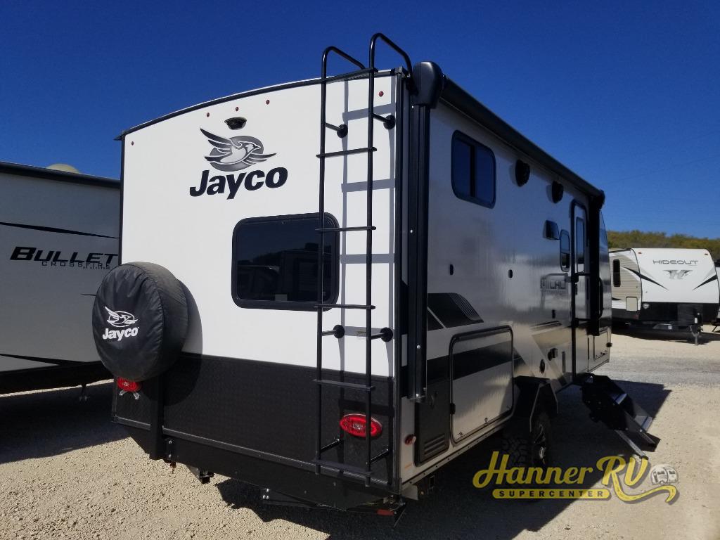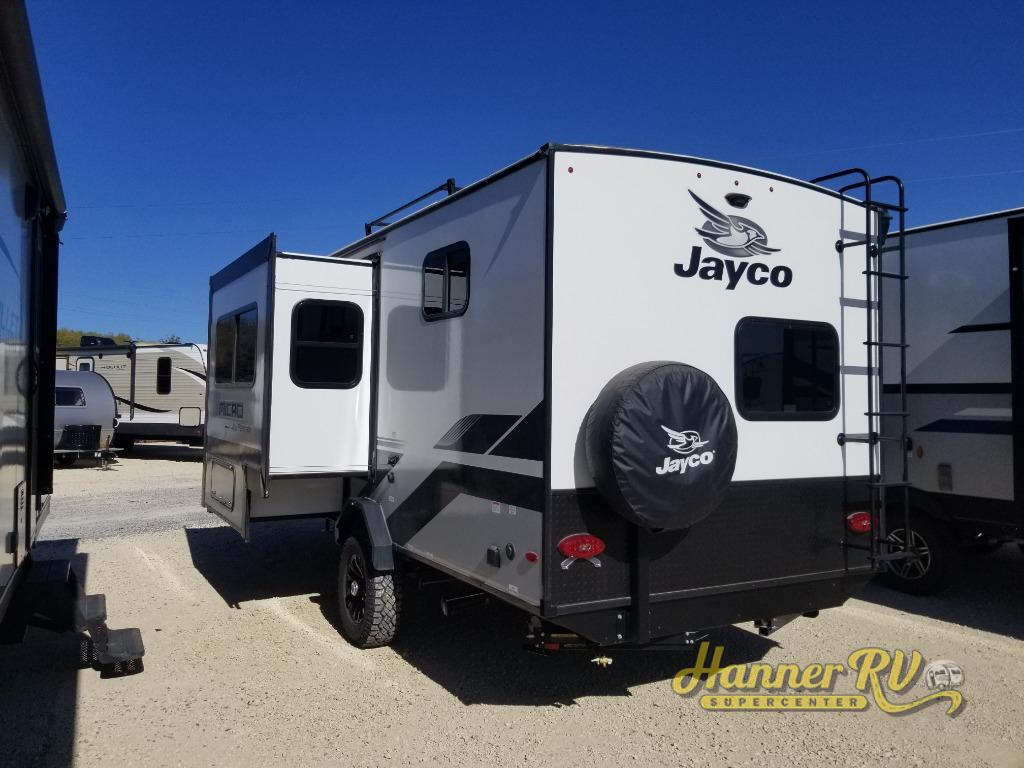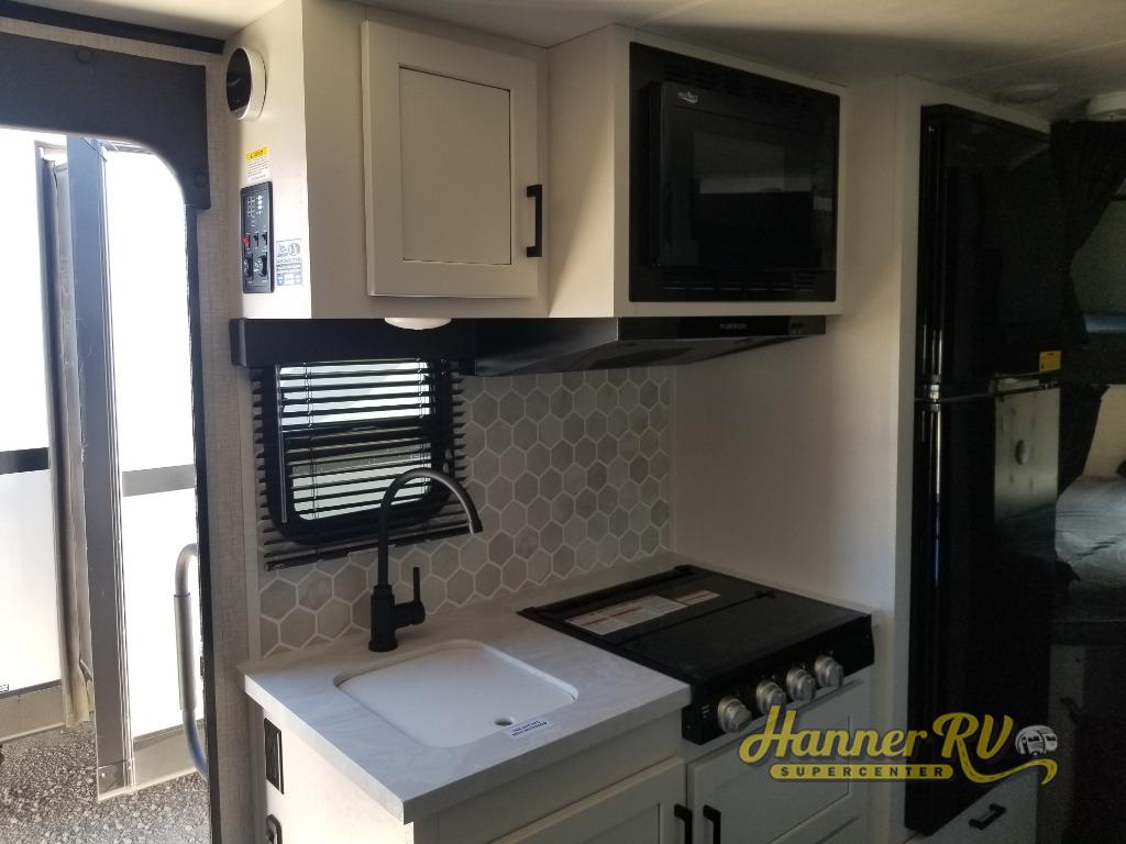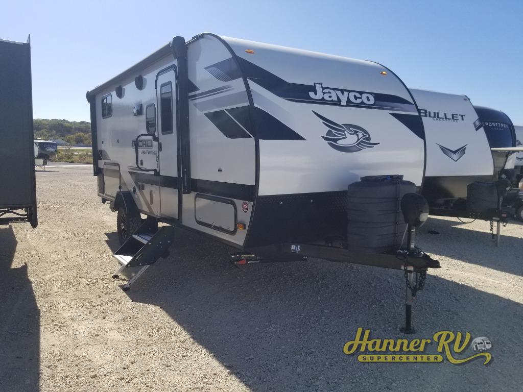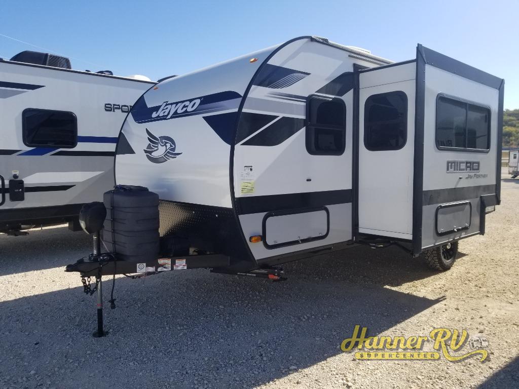 Jayco's lightest travel trailer, the Jay Feather Micro is ready for adventure at the drop of a hat! The Climate Shield weather protection will let you camp well into the colder months and the Stronghold VBL with double-sized Azdel is ultra durable. The Jay Pro Package includes 16-inch American-made Goodyear off-road tires with self-adjusting brakes, a rear-mounted roof ladder, and the Overlander 1 Solar Package with a 200W solar panel. Additional exterior features include marine grade exterior speakers with blue LED accent lighting, a swing-out entry door assist handle, a power tongue jack, and more! Inside, you will love the 4-inch high-density dinette cushions with vinyl backing for easy cleaning, along with the handcrafted hardwood door/drawer fronts, residential style kitchen countertops, and decorative roller shades with a reflective barrier for better insulation.