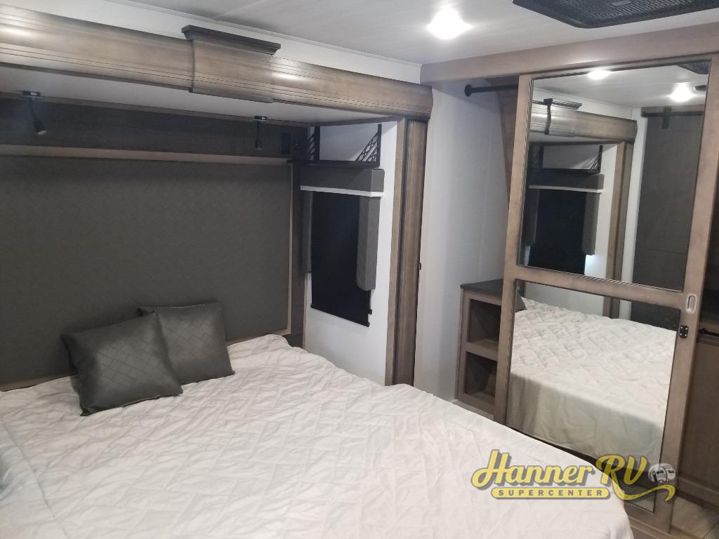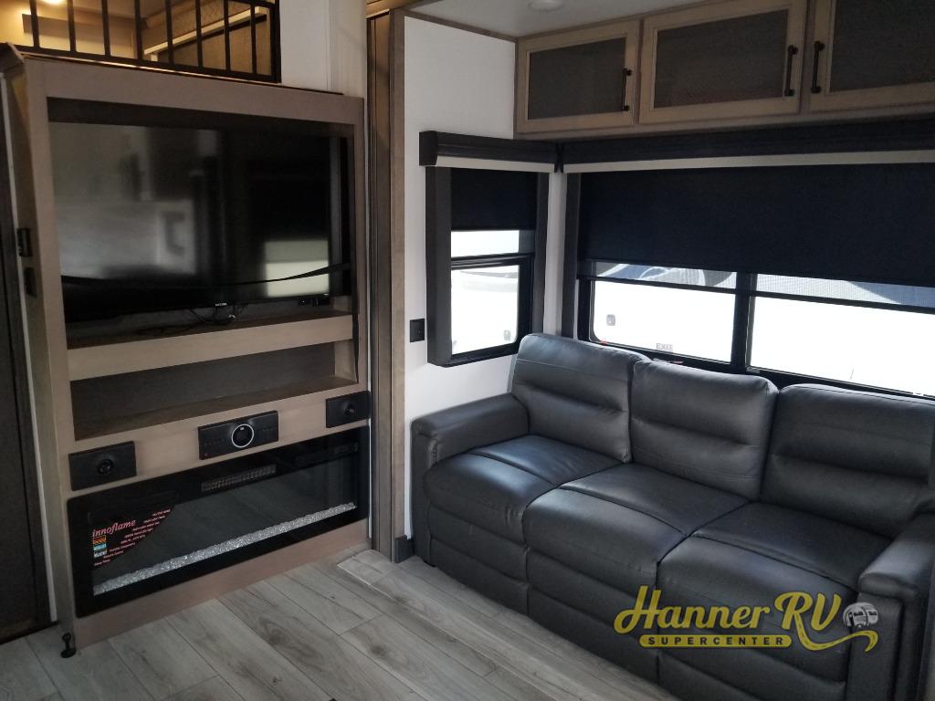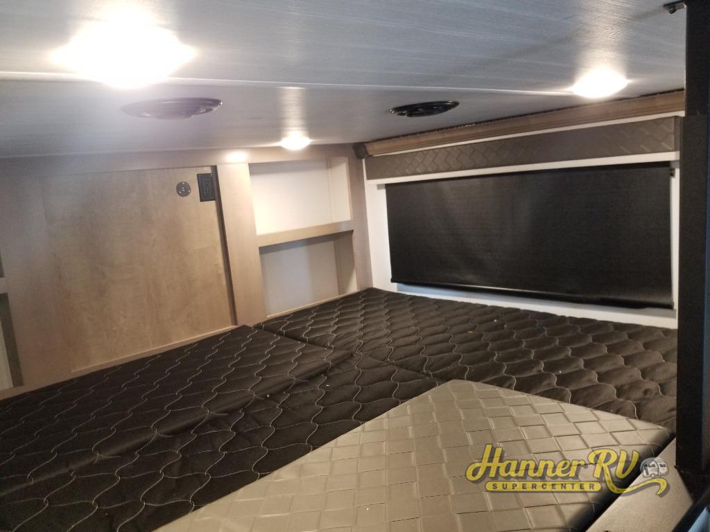Traveling with friends and family is easier than ever with this fifth wheel in tow! There are two master suites; one for you and one for guests! The front master suite includes a king bed slide out, a front closet with a hamper, plus stackable washer/dryer prep if you want the option to make wash day easier. There is also convenient underbed storage, a dresser with a Smart HD TV, plus a private entrance into the dual entry bath. Head to the rear master suite to find just as much comfort with a queen bed slide out, dual closets and a dresser, plus a full rear bath where the second entry door is located. There is also a loft area above this room with three bunk mats so two more tired campers can sleep! The middle kitchen and living area includes many comforts, like the power theater seating across from the 50" Smart TV and hide-a-bed sofa, plus the U-shaped kitchen with ample counter space and a 24" range. You'll also find food storage in the pantry and 18 cu. ft. residential refrigerator with an ice maker, or you can choose the slightly larger 20 cu. ft. refrigerator!