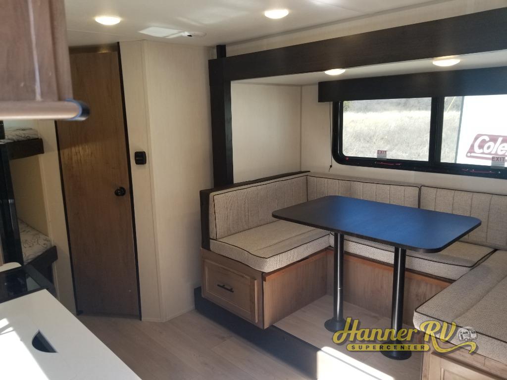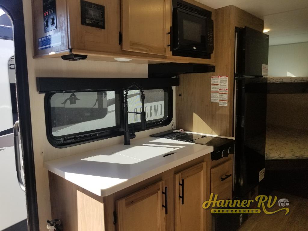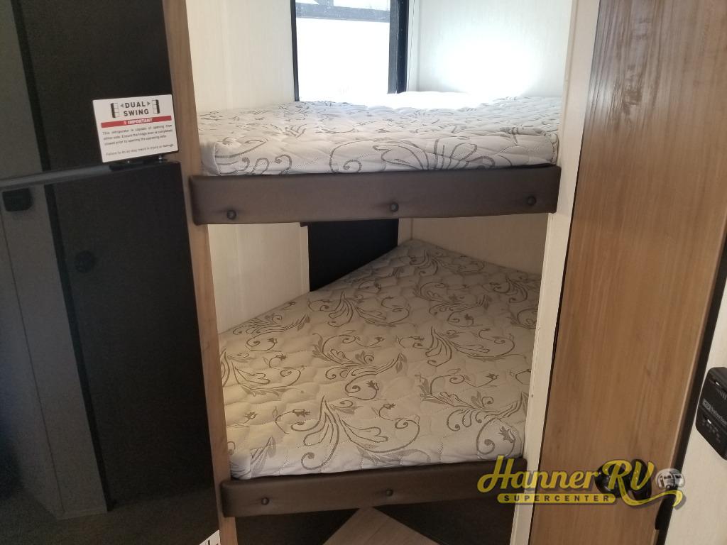 This family travel trailer is ready to head to the campground whenever you are! The kiddos can sleep on the set of double-size bed bunks and you can sleep on the front queen bed, plus the U-shaped dinette slide can also transform into an extra sleeping space when you aren't using it to enjoy a meal prepared with the high output cooktop. You can also prepare your delicious meals at the outside mini kitchen and stay protected by the power awning. The exterior not only has outside storage and an outside TV mount, but also features an outside storage plus door for access to the storage space underneath the bottom bunk bed. The rear corner bath allows everyone to stay clean and refreshed while you camp.