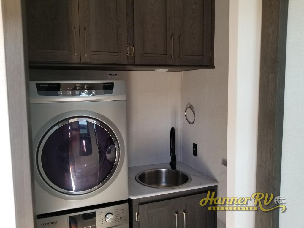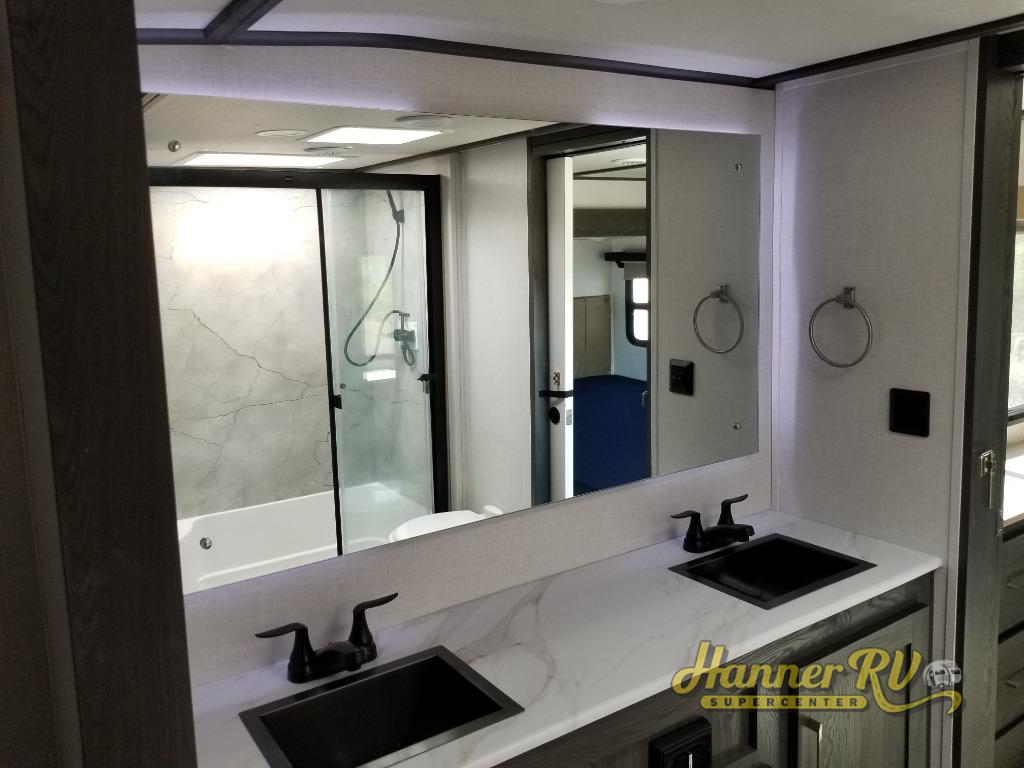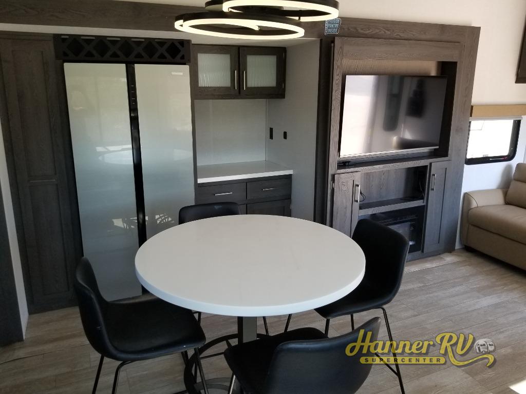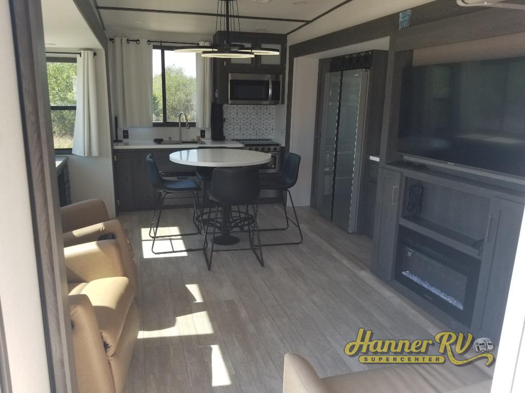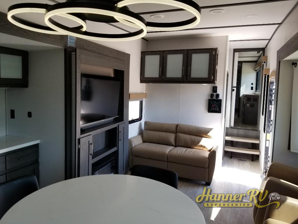 It's easy to see why this fifth wheel was voted Best New Model for 2025 by RV Pro! There are many residential features, such as a middle table with four seats, dual recliners, a desk to get some work done, and a master bedroom you are sure to love. You'll find a king bed with Versa Tilt technology, a dresser, and TV prep. A front master bath includes a walk-in shower with a skylight, dual bath sinks with a back-lit mirror, and a closet with shelves. The middle mud room includes washer/dryer prep, counter space and a pull-out drying rack to hang up swim clothes, towels, and more. Everyone will enjoy spending time in the main living room that includes dual opposing slides, a tri-fold sofa, and an entertainment center with hidden storage behind. And the chef of your group will love the rear kitchen with its 16 cu. ft. 12V refrigerator and pantry, an oven, and plenty of counter space. Head outdoors to enjoy the two power awnings in the evening!