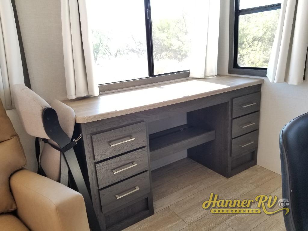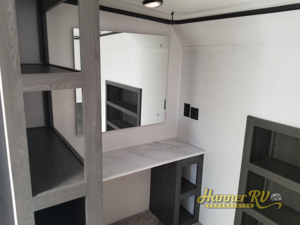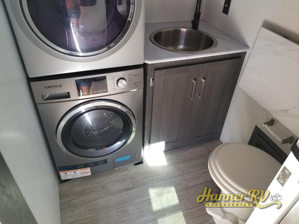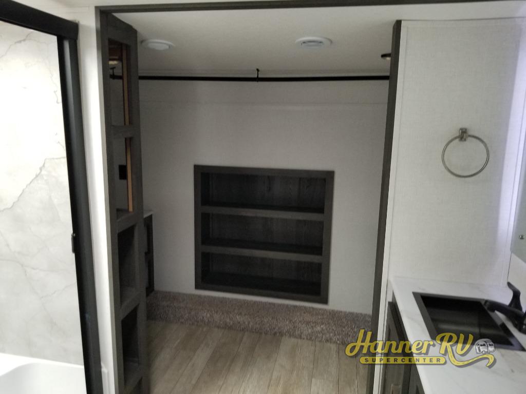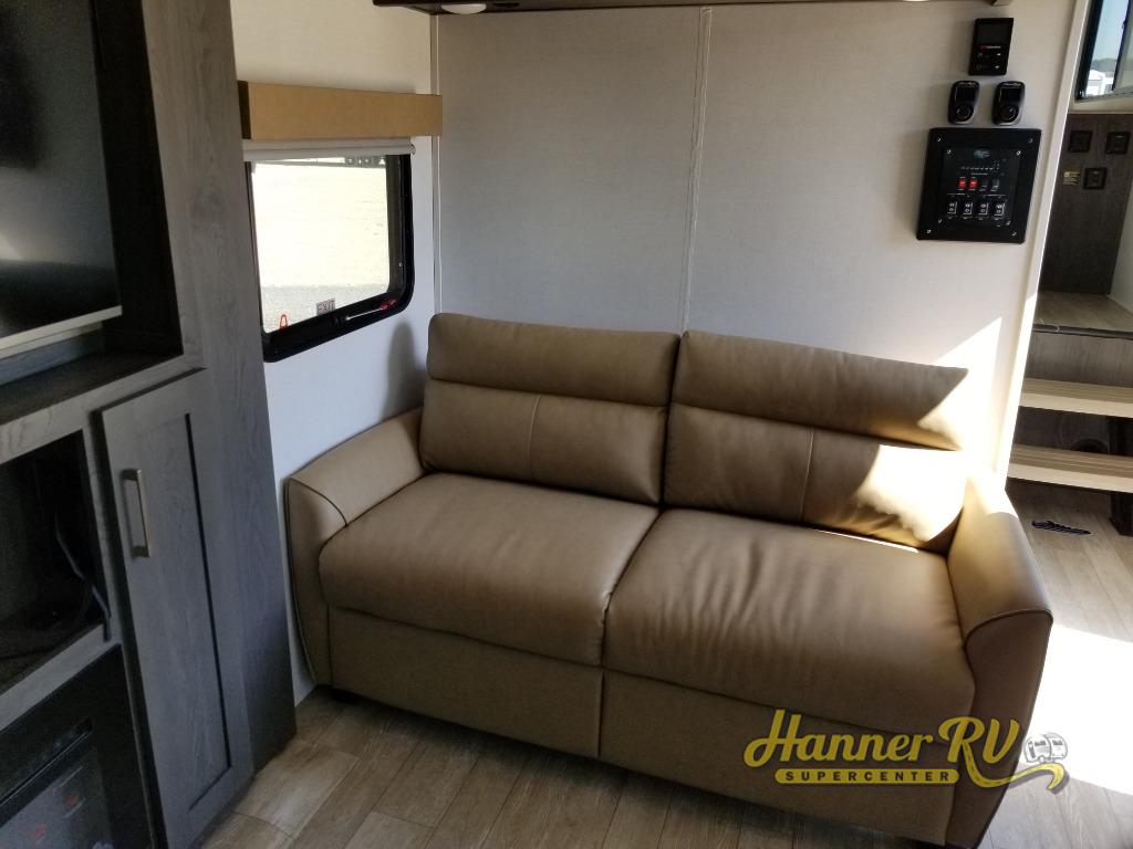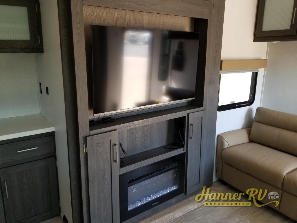 It's easy to see why this fifth wheel was voted Best New Model for 2025 by RV Pro! There are many residential features, such as a middle table with four seats, dual recliners, a desk to get some work done, and a master bedroom you are sure to love. You'll find a king bed with Versa Tilt technology, a dresser, and TV prep. A front master bath includes a walk-in shower with a skylight, dual bath sinks with a back-lit mirror, and a closet with shelves. The middle mud room includes washer/dryer prep, counter space and a pull-out drying rack to hang up swim clothes, towels, and more. Everyone will enjoy spending time in the main living room that includes dual opposing slides, a tri-fold sofa, and an entertainment center with hidden storage behind. And the chef of your group will love the rear kitchen with its 16 cu. ft. 12V refrigerator and pantry, an oven, and plenty of counter space. Head outdoors to enjoy the two power awnings in the evening!