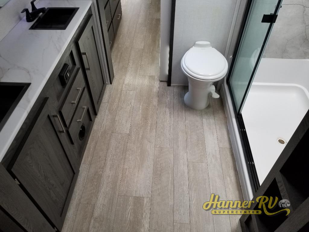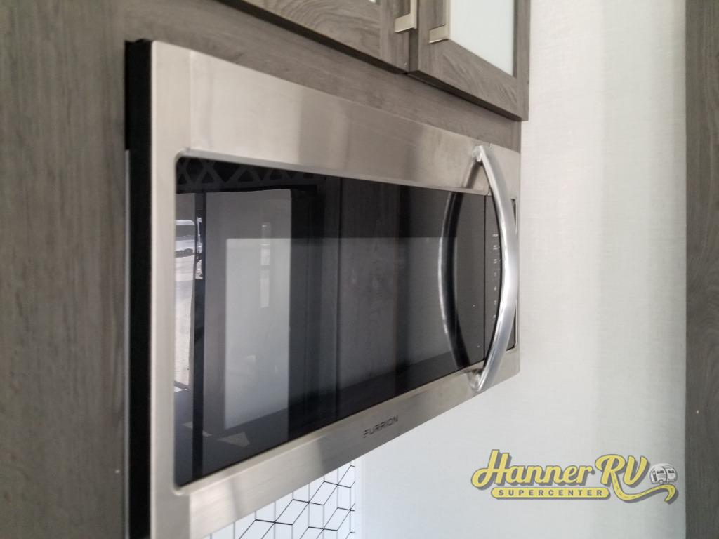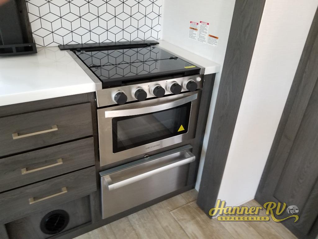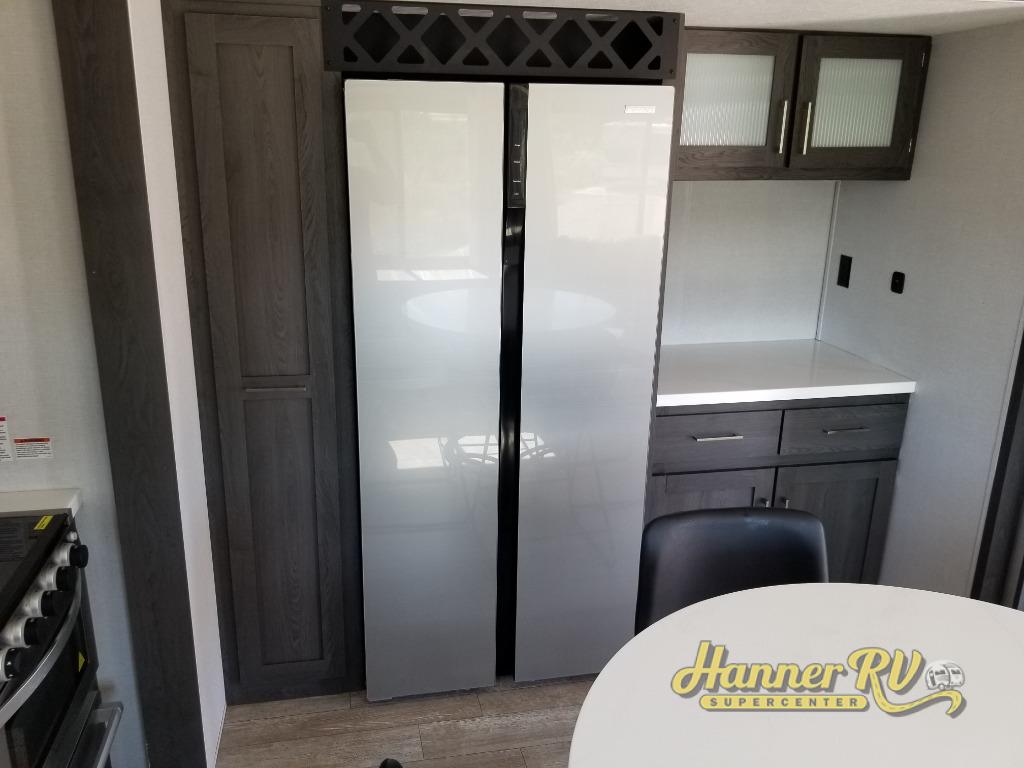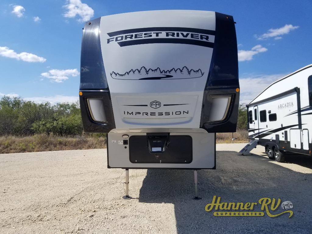 With any Impression mid-profile fifth wheel by Forest River, the focus of the design is comfort and value, built with quality craftsmanship and attention to customer's desires in each Impression! The exterior includes upgraded E-rated MAXXIS tires, custom exterior graphics package, and insulated slam latch baggage doors. There is also an enclosed docking station, an outside shower, and a 100W roof solar panel for off-grid capabilities. The fully heated and enclosed AccessiBelly has removable underbelly panels and offers four seasons of travel, and there is an industry leading 15K A/C plus 35K BTU furnace to keep you comfortable. The interior has lumbercore cabinetry, residential linoleum, residential backsplash in the kitchen, and oversized opening windows in the living area for more natural lighting and good air flow.