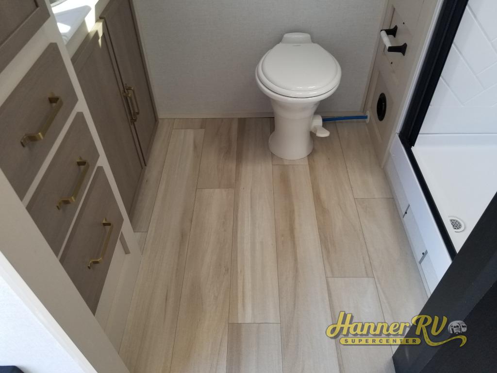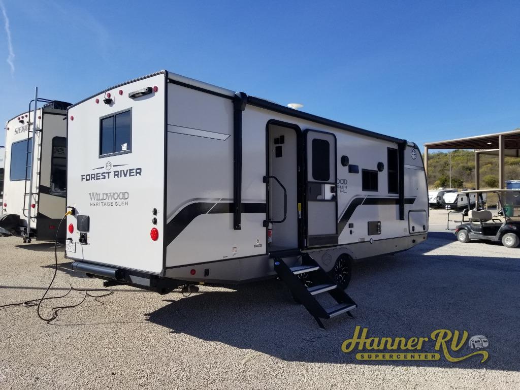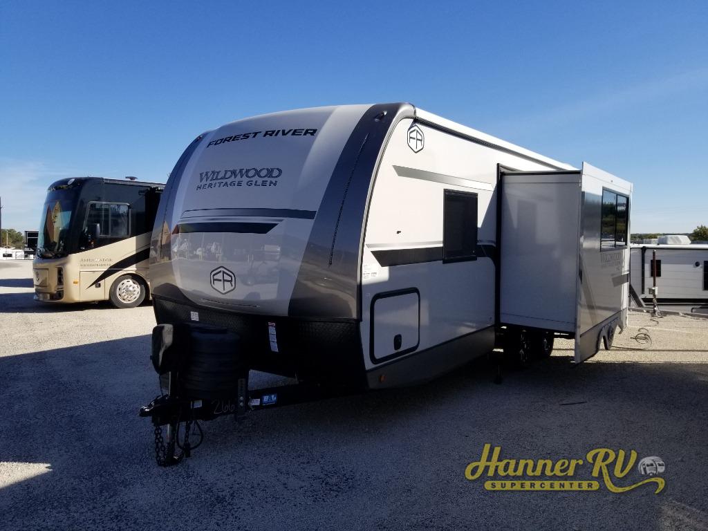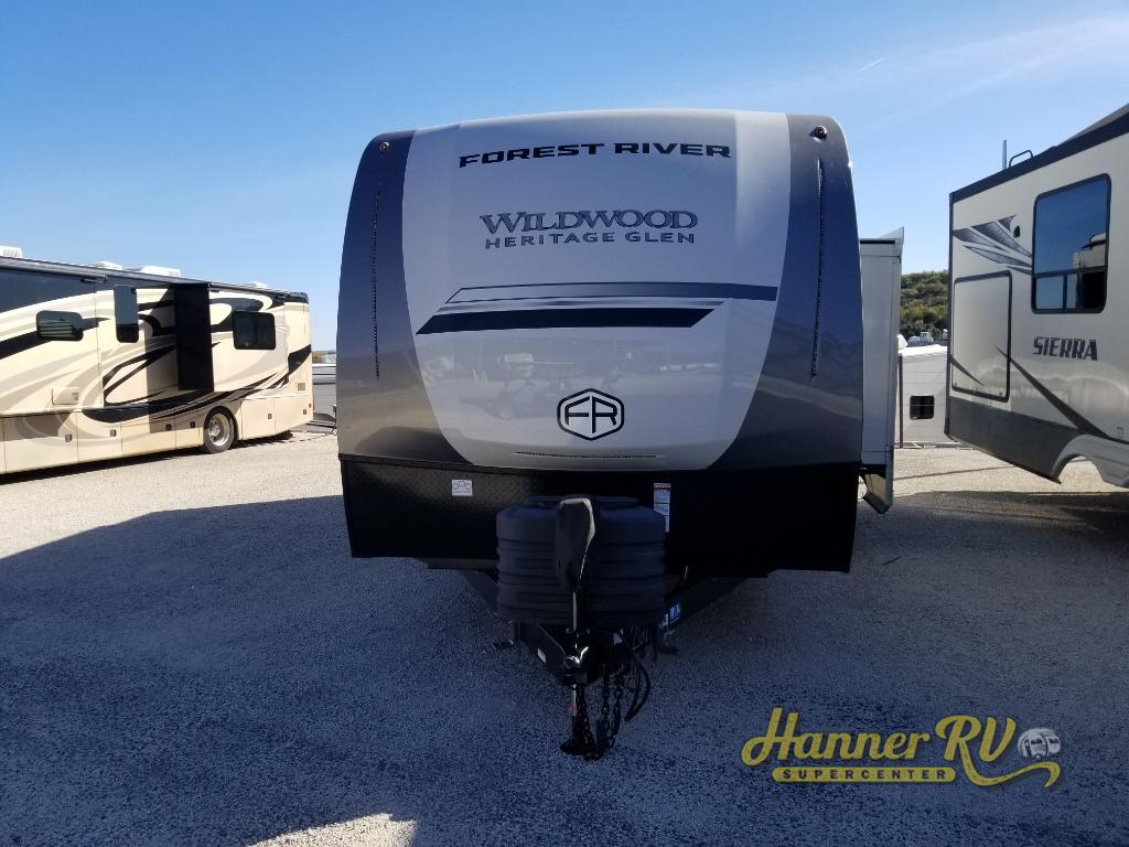 The Wildwood Heritage Glen Hyper-Lyte travel trailer by Forest River offers stability with a wide stance axle system, easy setup with a power tongue jack with an LED docking light, and safe entry with the Step Above aluminum entry steps. The interior includes Temple Cherry cabinetry with matte gold hardware, hidden hinges on the cabinet doors, and a residential single bowl undermount sink. You will also find a back-up camera prep and solar prep, an outdoor shower, Maxxis radial tires, and many more exterior conveniences.