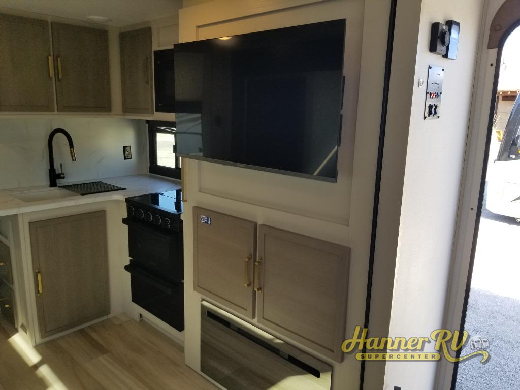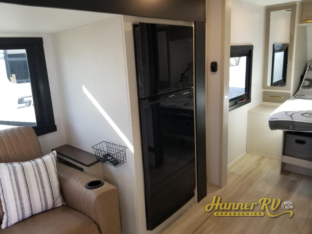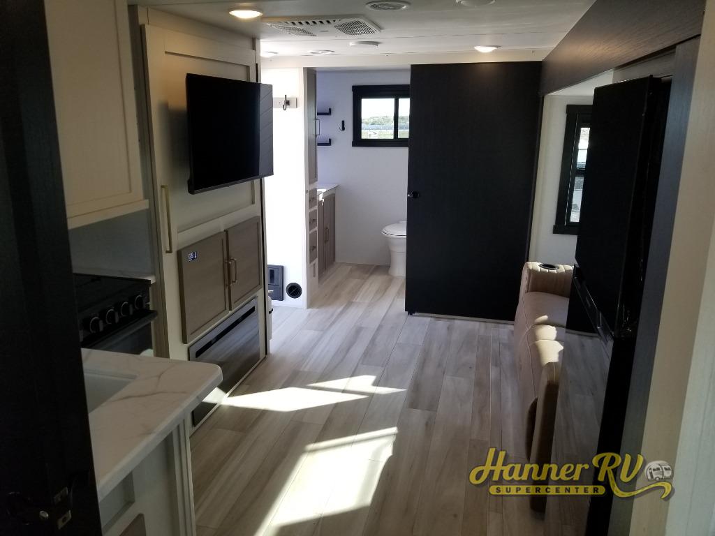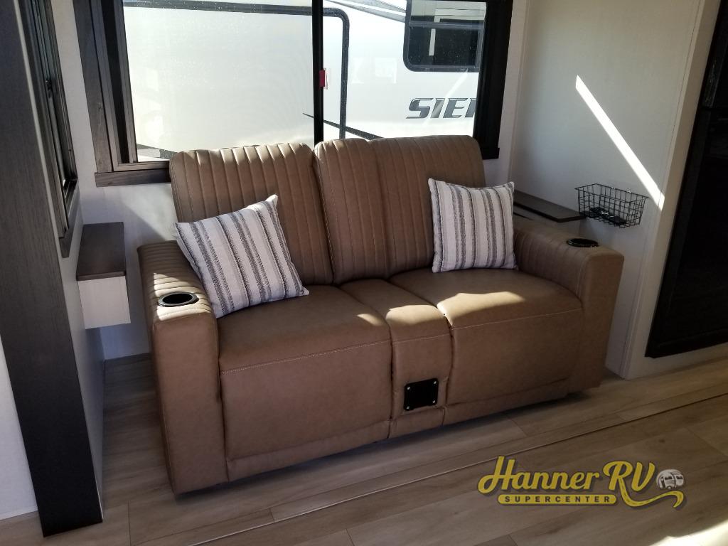 If you like to be different, this couples trailer offers theater seating and a removable table that you can relax on and dine at. There is also a swing-open entertainment center and a fireplace right across from the seats for perfect viewing. The kitchen has full amenities including a 12V black refrigerator and hidden storage behind the TV. The rear bath offers a walk-in shower with a skylight for more natural lighting, a large linen cabinet for all your essentials, a wardrobe and everything else you need to stay refreshed and clean without having to use the public facilities. The front bedroom offers a space savings door, a queen bed with Versa Tilt and dual wardrobes. You will also find a Texas-sized pass-through compartment outside for the outdoor gear such as camping chairs, charcoal, and such.