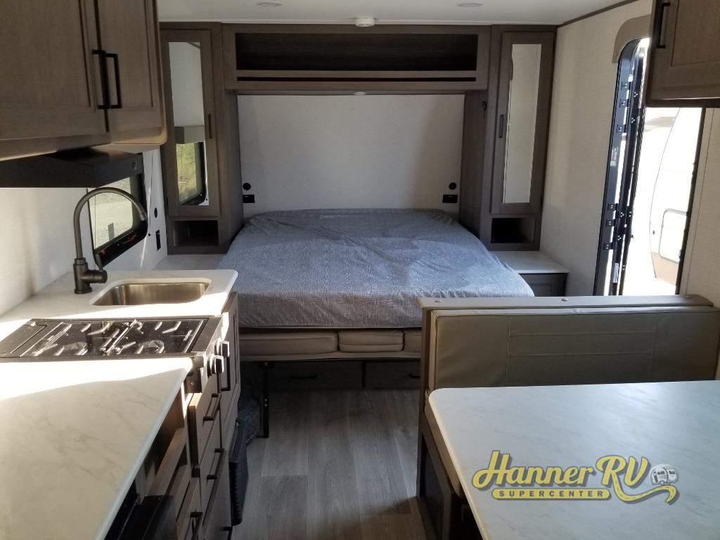 This is the perfect couple's trailer with versatile seating and sleeping space! You'll find a queen-size Murphy bed up front with storage space beside and above plus a full rear bath for added privacy. Once you've made lunch in the full kitchen, you can dine at the booth dinette, or take your plate outdoors to sit under the 10' power awning. You'll also find an unobstructed pass-thru storage outside that will be perfect for fishing poles, lawn chairs, tools and more!
