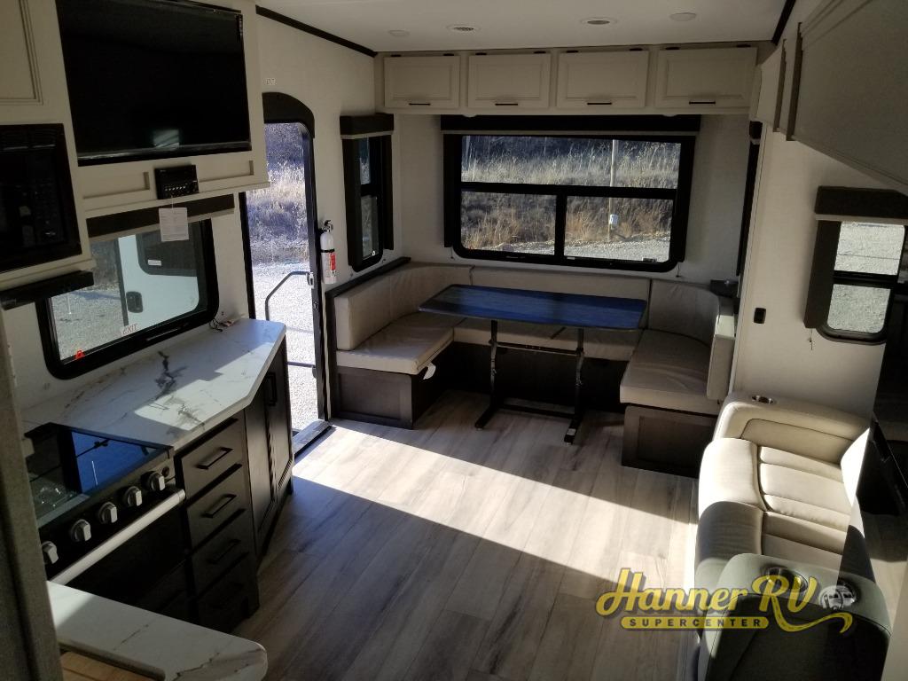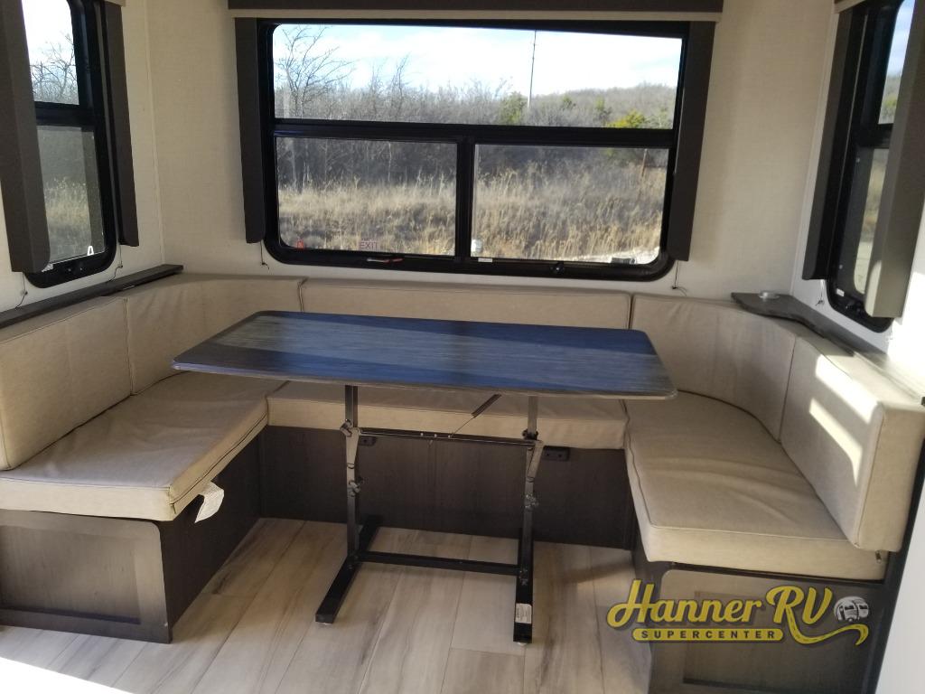 Trips to the lake are made complete in this spacious fifth wheel that can sleep six each night. You'll enjoy your own private bedroom up front that includes a queen bed, a wardrobe, plus bedside wardrobes and nightstands for your things. After you've made dinner on the cooktop, you can dine around the rear U-shaped dinette. There is additional seating on the tri-fold sofa, and both of these areas can double as sleeping space for guests. If you're wanting a little more comfort, just choose the optional theater seating in place of the sofa.