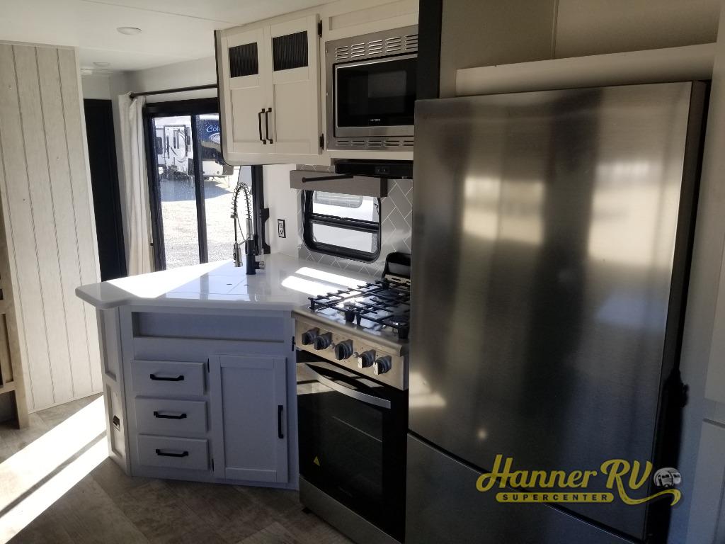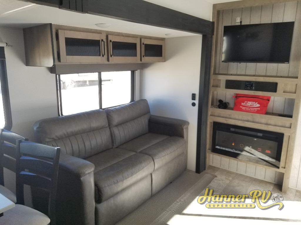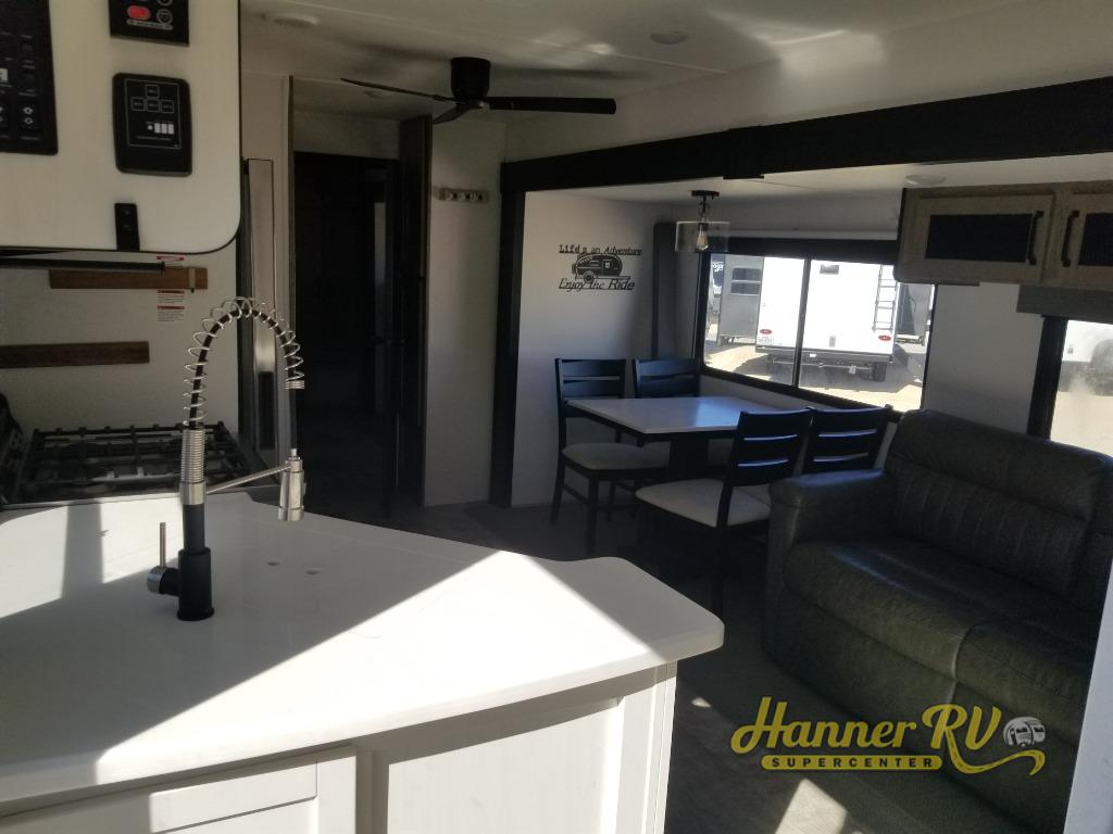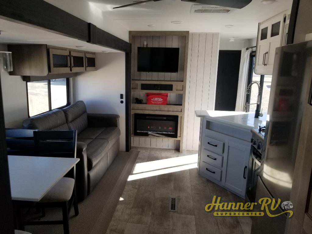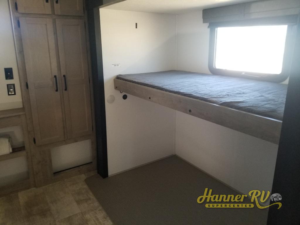 This destination trailer will probably be in the family for years to come with all of its features and amenities such as the rear private bunkhouse with a half bath attached, the dual entry doors for a smooth flow of traffic, and the spacious bedroom with a slide out king-size bed. There is even a closet with the option to add washer and dryer prep. The bunkhouse includes a slide out bunk with a jiffy sofa below, a slide out set of bunks, plus an entertainment center in between two wardrobes. The main living and kitchen area offers full amenities, a U-shaped dinette to dine at, and a sofa to relax on. You even have an optional outside kitchen to cook meals in the great outdoors!